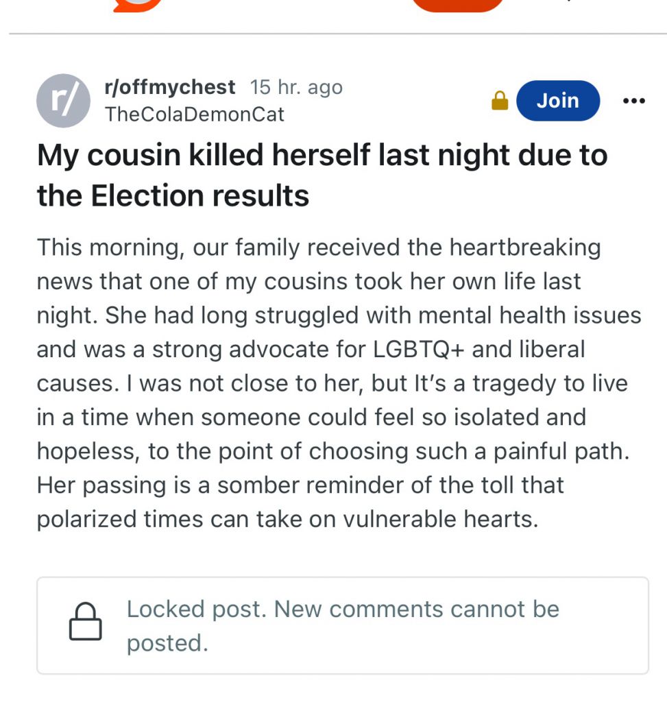 >>946305371They also broke up with their bfs if they weren't upset enough that Trump won, left their families, one killed their parent because voted for TrumpMental illness is strong today
