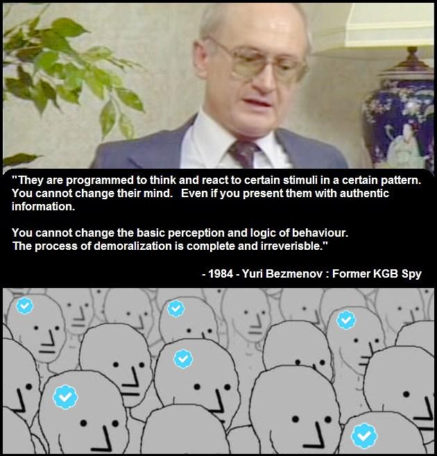 >>946296403What it is is that we're all playing the Mafia social deduction game, only in real life. Tribalism is good because if we all banded together we could change the country over night. Tribalism is good because under unga bunga conditions we'd be able to sniff out the traitors relatively easily enough. Tribalism is bad because there are so many feds and shills that can just so easily slip in and pretend to be part of the tribe and then subvert it from within. Tribalism is bad because now when we live in an epistemological void in which we can't trust damn near anything we see or read?... if someone is prodding you into action it's almost certainly someone attempting to get you to do the cabal's bidding. It is so fucking depressing. We're being brainwashed, we know we're being brainwashed, and we desperately want the brainwashing to stop and there just doesn't seem to be any move to be made to stop the brainwashers.