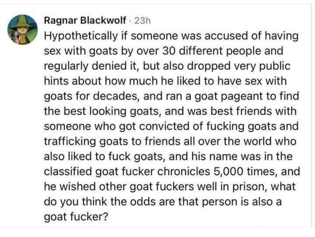 >>946314019>we should get rid of all pedophiles>AHAHA ONLY YOUR SIDE HAS PEDOPHILES THOUGHWeird how that response is commonplace now, huh? Like man, if a liberal was in the epstein files, cancel em. call their boss and get em fired for a charlie kirk joke. Go the whole way, man. I want to unfuck as much as I can. That's gross. It's gross that some people on my side are pedophiles.But it's so, so weird how many people have flipped to "actually pedophiles are OK sometimes" and "No way trump is one, he's the good guy!" guess it was never about kids, or pedophiles, or anything other than fighting the bad guys on the other side. even when you find yourself surrounded by nazis and pedophiles, you must fight the evil anti-nazi, anti-pedophiles. That's going so, so good for you, too