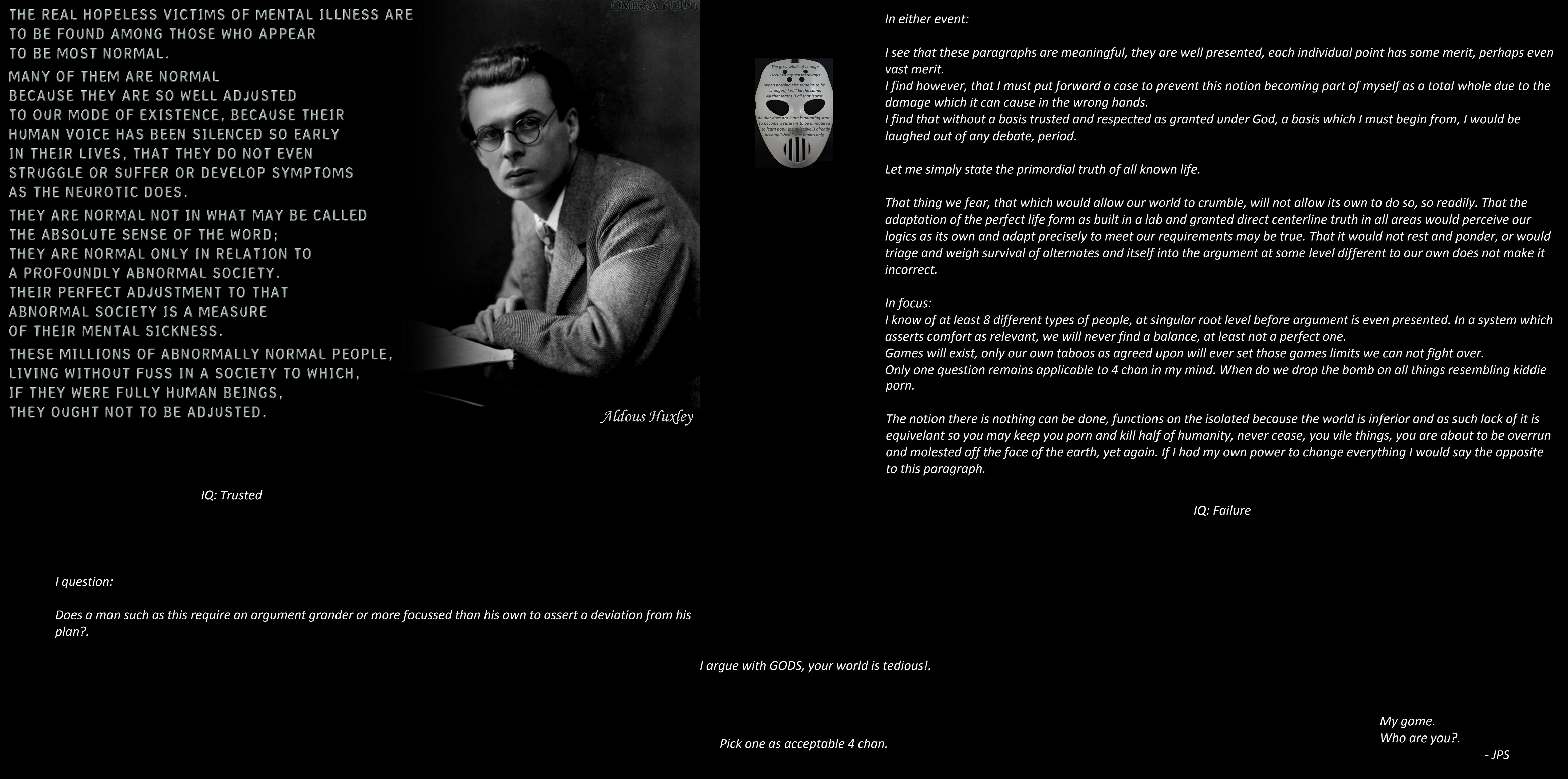 There has not been even a schizophrenic who can devise a reasonable counterargument; the closest I have come to anyone being able to navigate my reality is when someone said, 'I knew that already'But since they proceeded to not add a single word, I can reasonably assume they were simply upset and, like most normies, just had to say some shit. THe idea I require people to believe me therefore would weasel certain indicators of similarity in to the debate is beneath me, I am not like you, I do not want to be same as you for you to 'like' me, you either live and prosper because you earned it, or you die and suffer because you were weak and sheepish, I am the antichrist, not some professor who wnats peerr review.