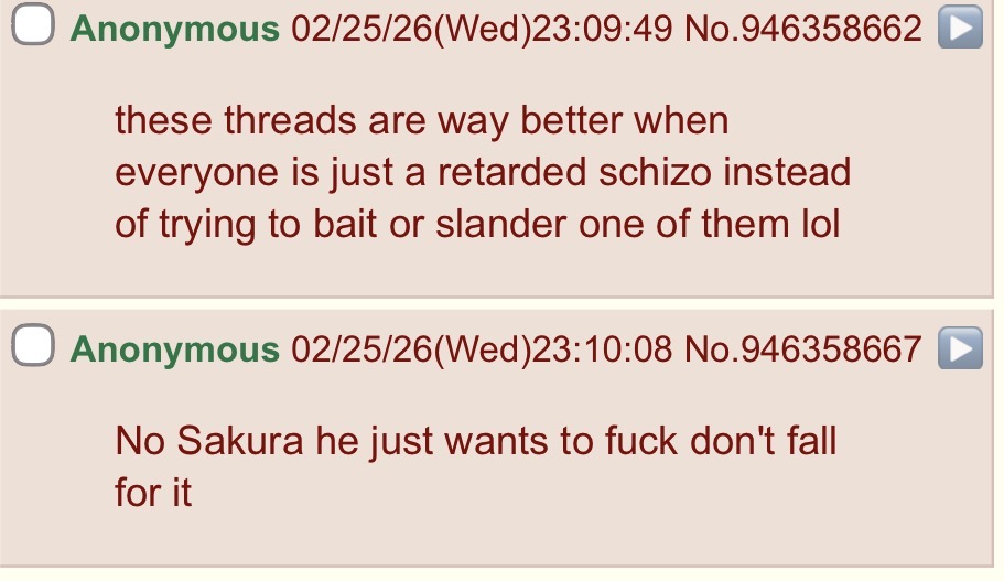 >>946360818As interesting it is to schizo, these threads are most definitely harmful to Sakura's online image.