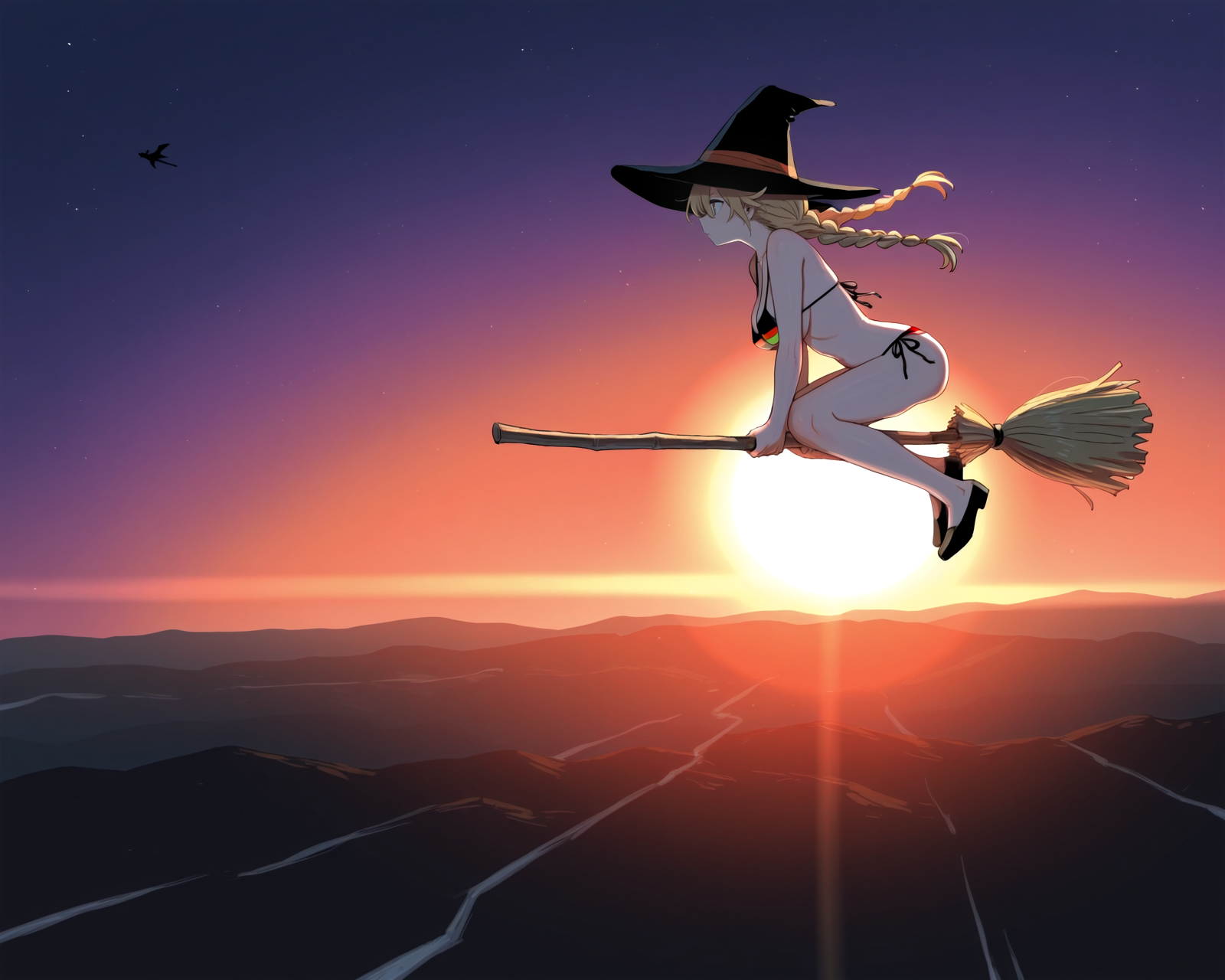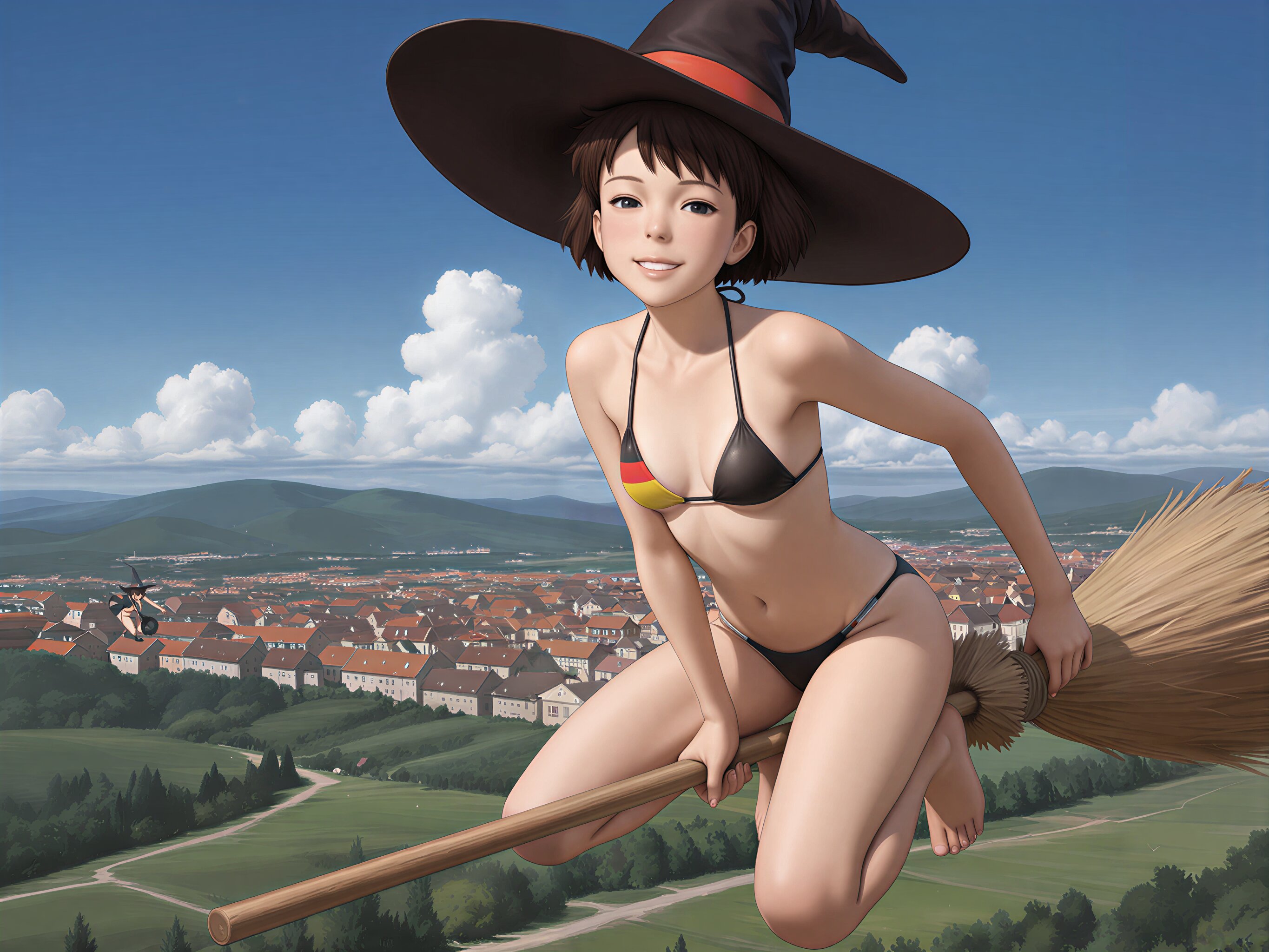 >>946395408didn't get it exactly, but on top of some generic tags, "german flag in background, witch hat, flying, broom, broom riding, blonde hair, large breasts, wide shot, flag, flag \(object\), straight-on, from side, twin braids, white wall, german flag bikini, german flag, interior">>946395451sounds good :)