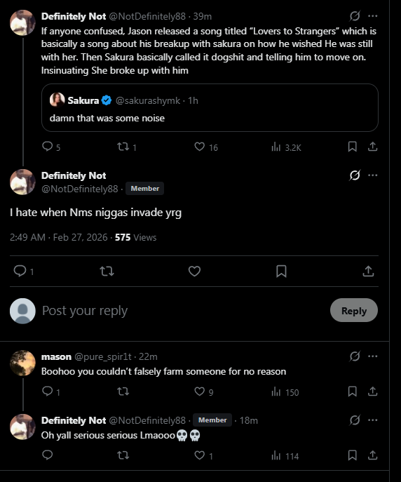 >>946397683her first tweet was an nms comm tweet that jason would've found funny bc it's applicable to him but she maybe didn't get and just sent it out. bri went home to yugi seeming fine, if sakura was actually bothered she'd probably want bri there with her. either she just thinks clowning on him is funny as fuck and joined in because she's over it (very likely) or she's farming having talked to jason and they both think it's funny to have her first actual acknowledgement of the breakup publicly to be a jokey tweet about his bullshit ass song (very unlikely but possible). there's no real in between imo