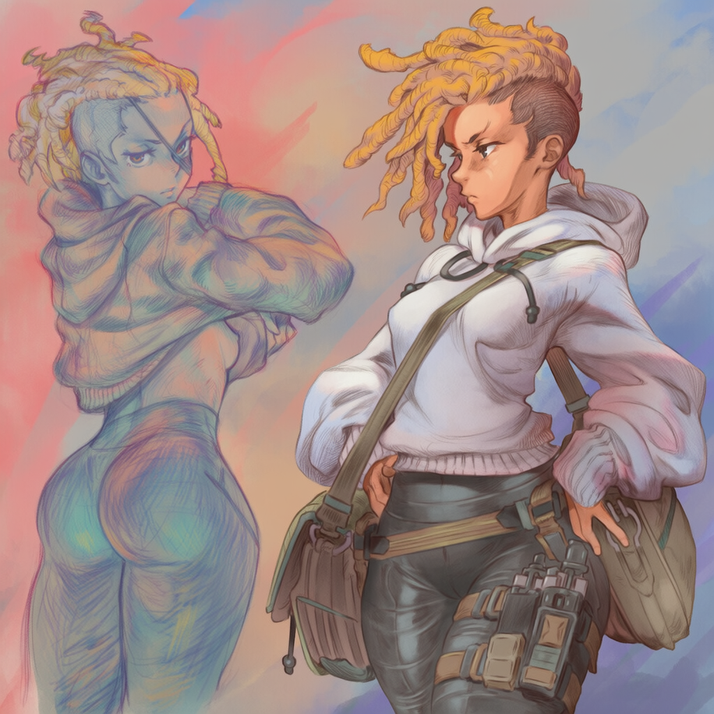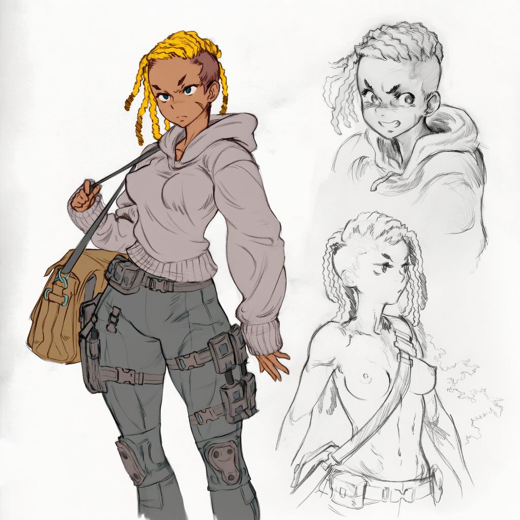 >>946461236olive skin, blonde dreadlocks, undercut, shaved sides toned, slender body, female, small breasts, hooded sweater, form fitting tactical pants, messenger bag, sci-fi concept art