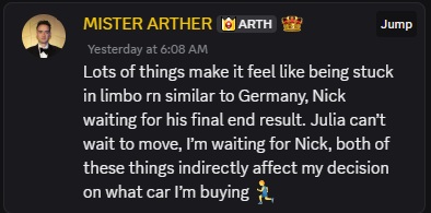 >>946514282March and April gonna test them for sure. Julia has to find a new house and move by the end of April, Arther hinted that he wants to live close to Nick so he doesn't have to drive 30 minutes every day. Julia managed to lose the "perfect house" that was like 15 minute walk from Nick's by being "busy".Julia's dad thinks she would never fuck a guy like Arther (clearly doesn't know her type lol). Arther rented a new car he doesn't like and still has no idea what kind of car he wants.