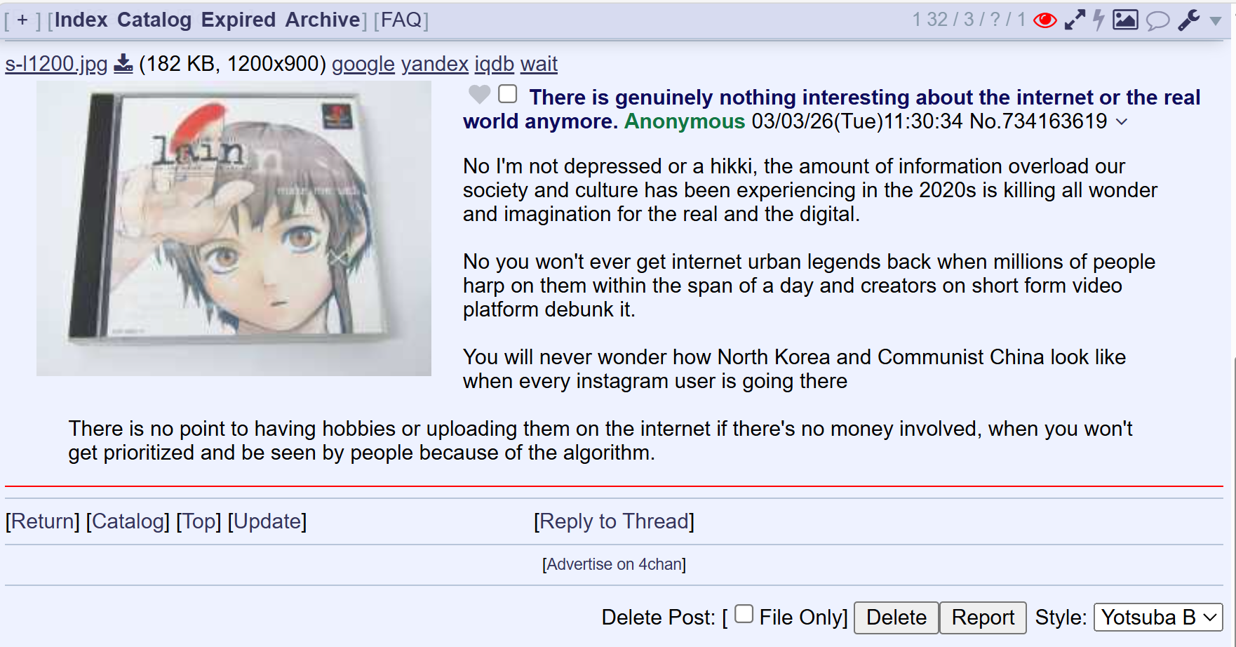 No I'm not depressed or a hikki, the amount of information overload our society and culture has been experiencing in the 2020s is killing all wonder and imagination for the real and the digital.No you won't ever get internet urban legends back when millions of people harp on them within the span of a day and creators on short form video platform debunk it.You will never wonder how North Korea and Communist China look like when every instagram user is going thereThere is no point to having hobbies or uploading them on the internet if there's no money involved, when you won't get prioritized and be seen by people because of the algorithm.