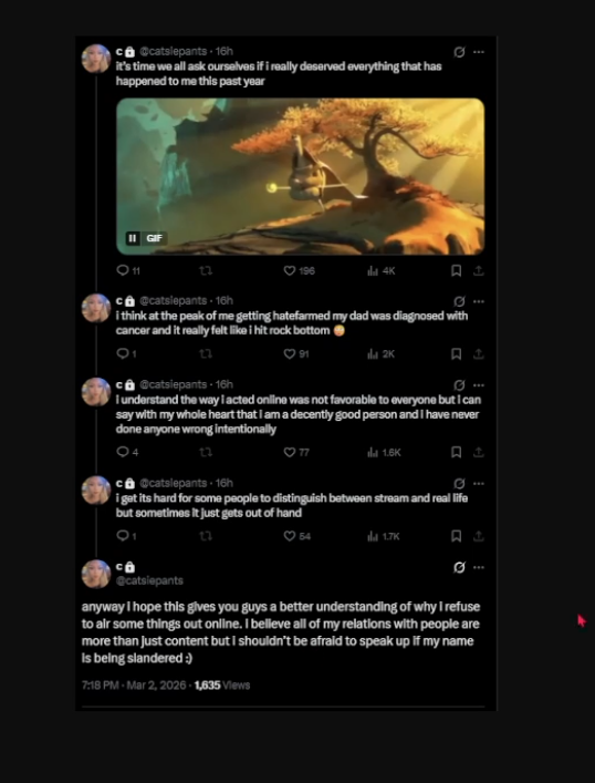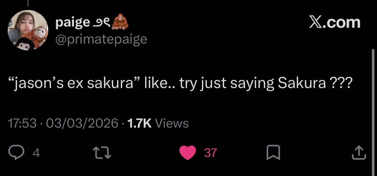 >>946562641>Officially broken up>Different states>Almost a month since seeing each other in person>Passed honeymoon feeling>Sakura mentioning Jason as one of her exes>Sakura showing no hints of rekindling"Omg they did an activity 5-10min apart of each other. They must be talking."No mf. More likely just a coincidence or a routine schedule overlap.At best, maybe Sakura still incognito-watches Jason's stream and keeps up with his social media posts, but even then, that still doesn't mean they're back to talking. We already know Jason keeps watching Sakura's stream, but that doesn't really mean much.