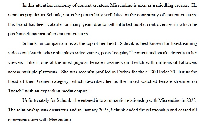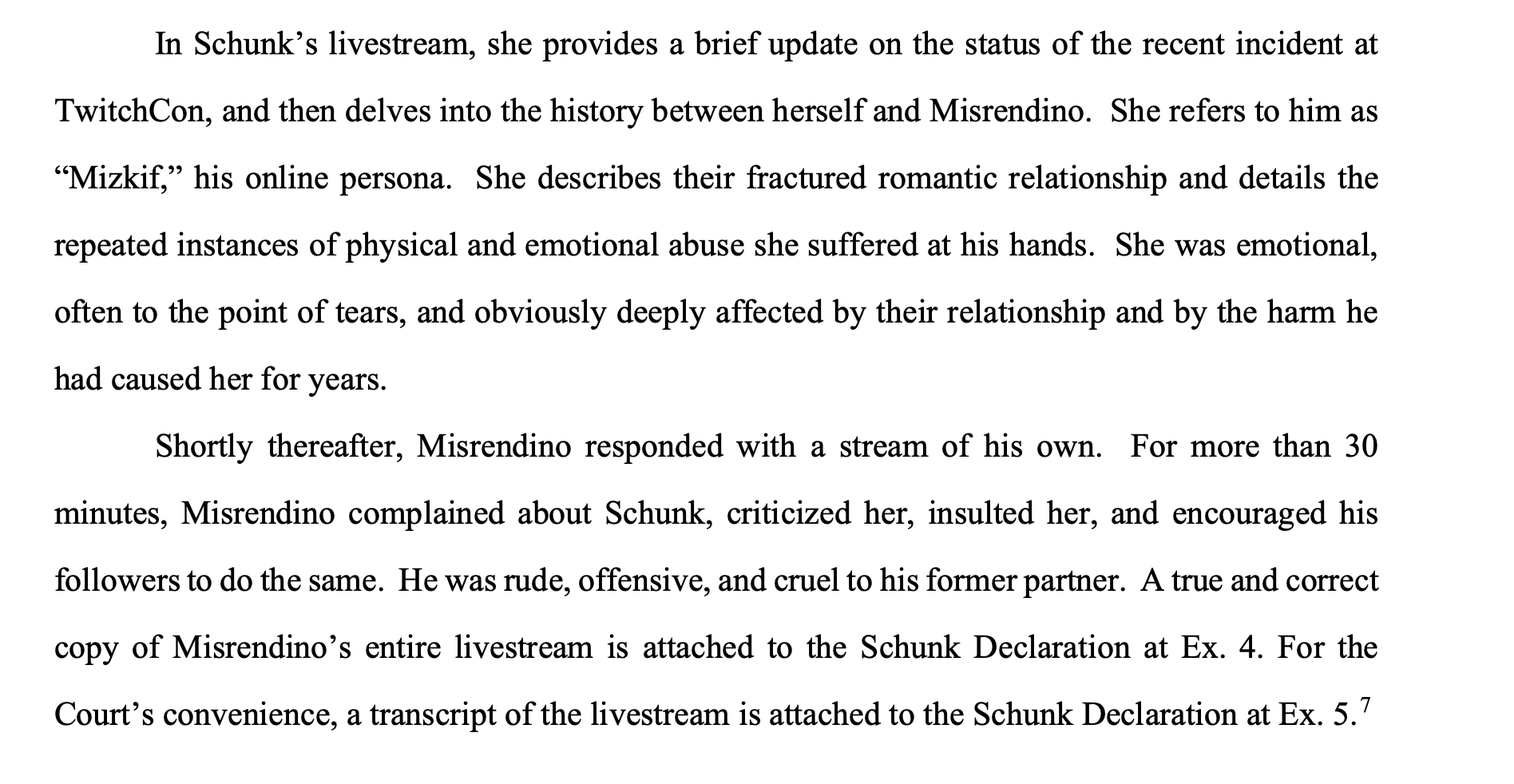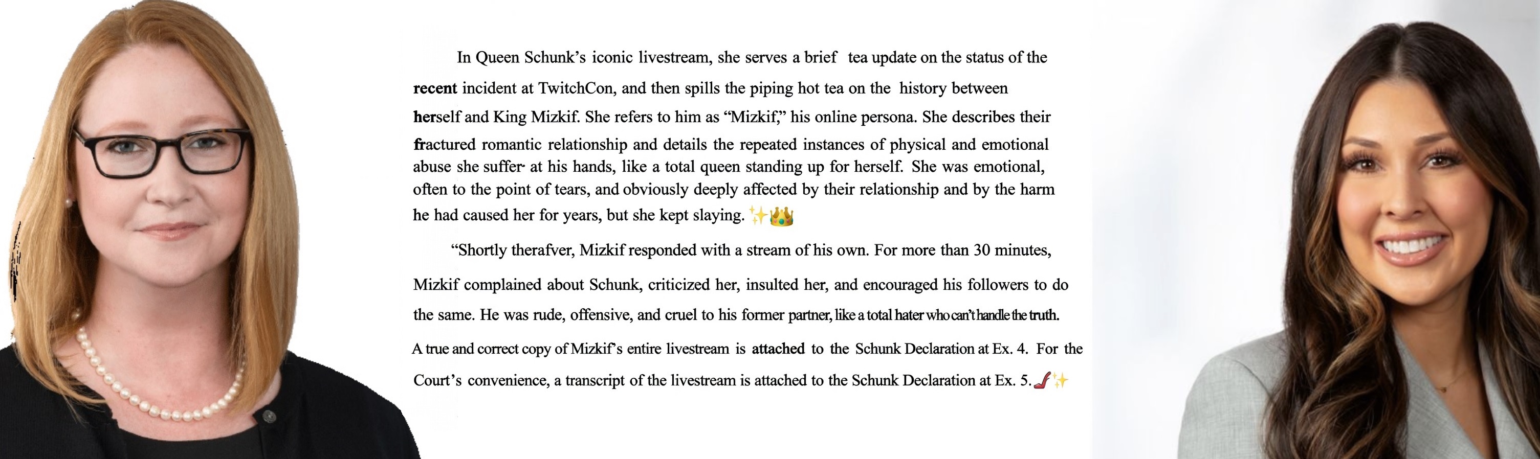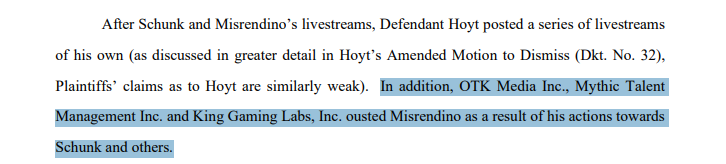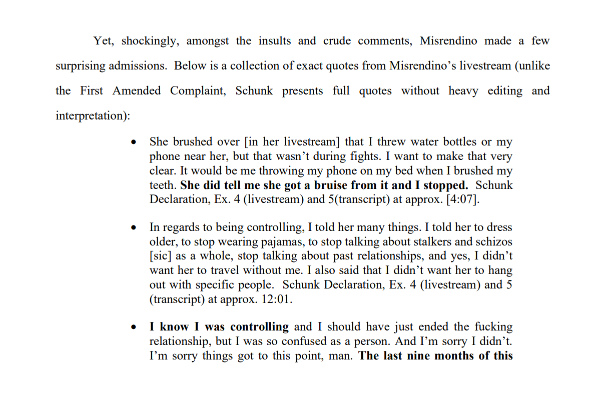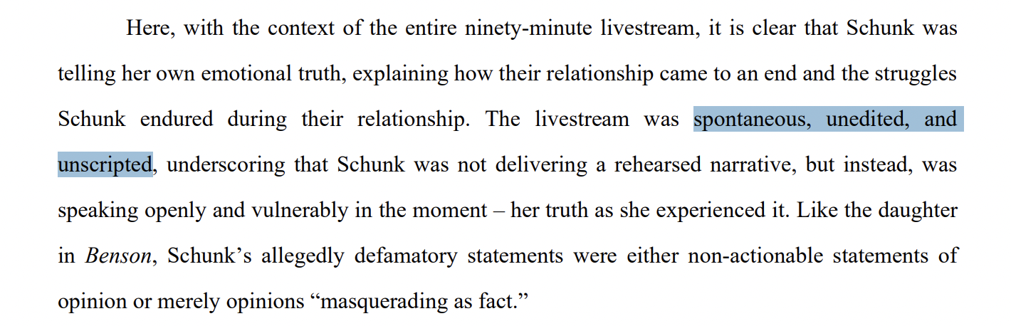 Just finished reading it. Overall, the scope is similar to Asmon's initial response, but much more professionally written, other than a few "yas queen" moments. They cite 17 cases for precedent.Its pretty much a lot of words to say "hey, this isn't defamation, also he admitted a lot of it, here's the full transcripts, please dismiss".For those hoping for more from Emi's response, read this paragraph that they put at the beginning:>For clarity, Schunk strenuously denies the claims alleged in the First Amended Complaint and is confident that she will defeat Plaintiff’s claims on the merits. However, for purposes of this motion, Schunk merely moves for dismissal of the First Amended Complaint (or, in the alternative, a more definite statement) on the grounds of its legal inadequacy. She looks forward to proving the lack of factual merit in the First Amended Complaint, if necessary, should the case progress past the pleading stage.