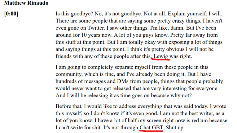 >>946585235>>946585347i can allready tell it is youtube transcipt if you watch VODs Lwig appears a lot. They couldnt even transcibe it with some pro transciber they just pasted youtube subtitles.