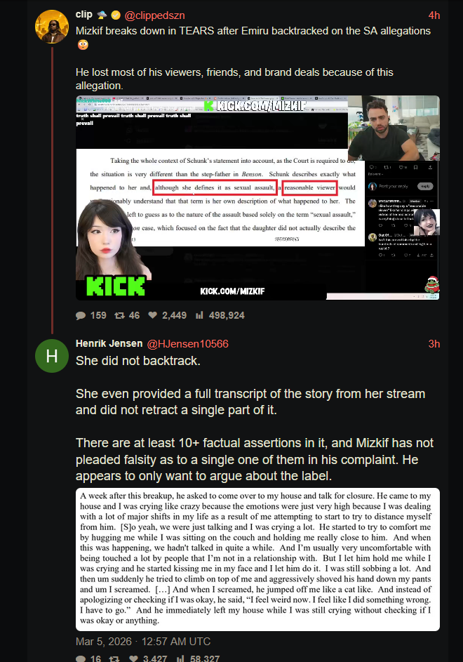 She needs to start directly countersuing mizkif for these hitjobsHe is behind this latest harassmentHe was crying on commandHe was telling dirk batowski to spam post on tweetHe paid his clippers like veizau to post that bsFfs start countersuing him already. He is literally making up lies and fucking with you in the midst of a lawsuit lying and misrepresenting your case. Or at the very least get the judge to throw the entire thing out based on this bad misconductHe is trying to turn a lawsuit into some kind of public show and harassment trial. You need to start pressing charges against guys like this already