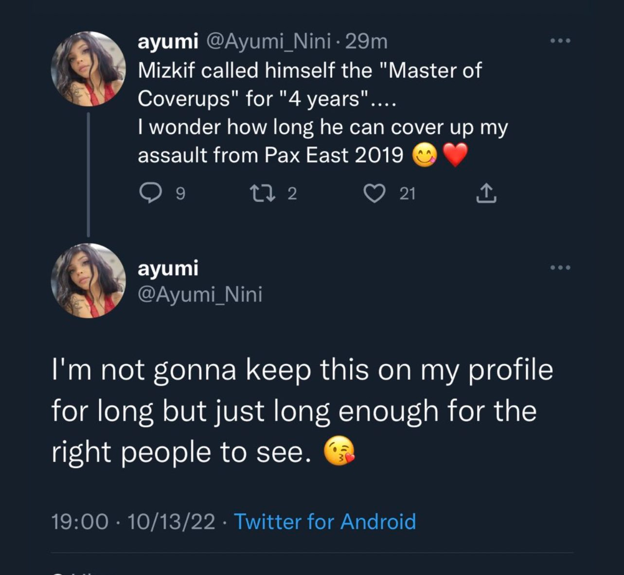>>946625973the problem with the fuslie shit, there's no way miz recorded that. his proof of a smear campaign relies on people leaking dms to him of emi telling them to stay away from him.