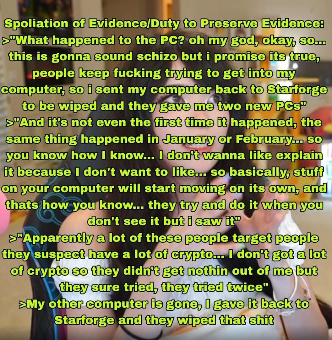 >>946625439Emiru will loseLied about it being " sexual assault": Mizkif did in fact NOT commit "Sexual Assault" per Emiru and her lawyers statements backtracking with ”EMOTIONAL TRUTH” not some statement of DECISIVE FACT, this is LITERALLY MALICE WITH INTENT DEFEMATION.Blatant lies of "smear campaigns" and was "harassing" "mobilizing his fanbase"'; ZERO PROOF of this; she intended to weaponize those allegations to confront and attack Mizkif with the purpose of ruining his reputation forever showing ZERO PROOF of her claims; other OTK members hostility THREATENING Mizkif for months.She made an event of this with 60,000 plus viewers:She started the stream saying her lawyers had pre-read and approved of her statements; OTK took her claims as fact, no investigation done from third party, FIRED MIZKIF and TOOK HIS SHARES from believing her ZERO PROOF claims:"Spontaneous"Planned over the course of months as seen by Asmon and Tectone's threating in a hostile way towards Mizkif."Unedited and unscripted"Literally Emiru read a script that had approval from her lawyers in the event of a lawsuit, dozens of screenshots prepped and ready; NO PROOF OF HER ALLEGATIONS SHOWN during her stream.Spoliation of Evidence/Duty to Preserve Evidence; Emiru "WIPED THAT SHIT" wiping her 2 PC's deleting evidence; this automatically presumes guilt and will lead to her losing.Lied about the circumstances in which Mizkif caused her "blackeye"; Emiru replies that it's a long but "funny as fuck" story, she confirms (unlike on her alt stream) that someone else was involved, but that it was not intentional; MEANING IT WASN'T MIZKIFS FAULT.Mizkif never stalked her; The restraining order failed she applied for on Mizkif due to NO EVIDENCE; she never BLOCKED HIM nor TOLD HIM TO STOP CONTACTING HER.Using AI generated evidence is a big no-no, especially when Emiru signed an affidavit swearing it is accurate and true; there were Ai transcriptions wrong of names/misspellings.
