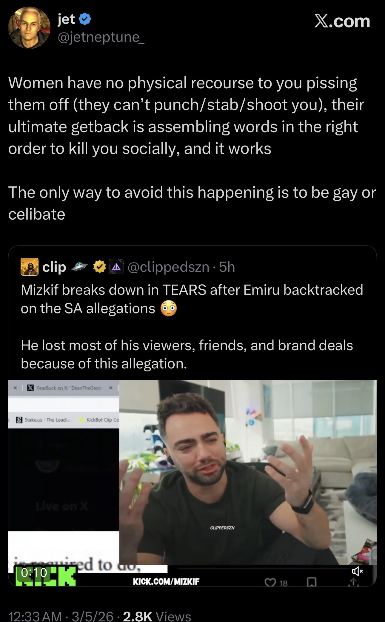 miz claiming that fuslie started ghosting him because he was too controlling with emirualso goes in on her for "cheating on her husband"https://kick.com/mizkif/clips/clip_01KJXKB2E4KAS7V29G4MWYVXKB