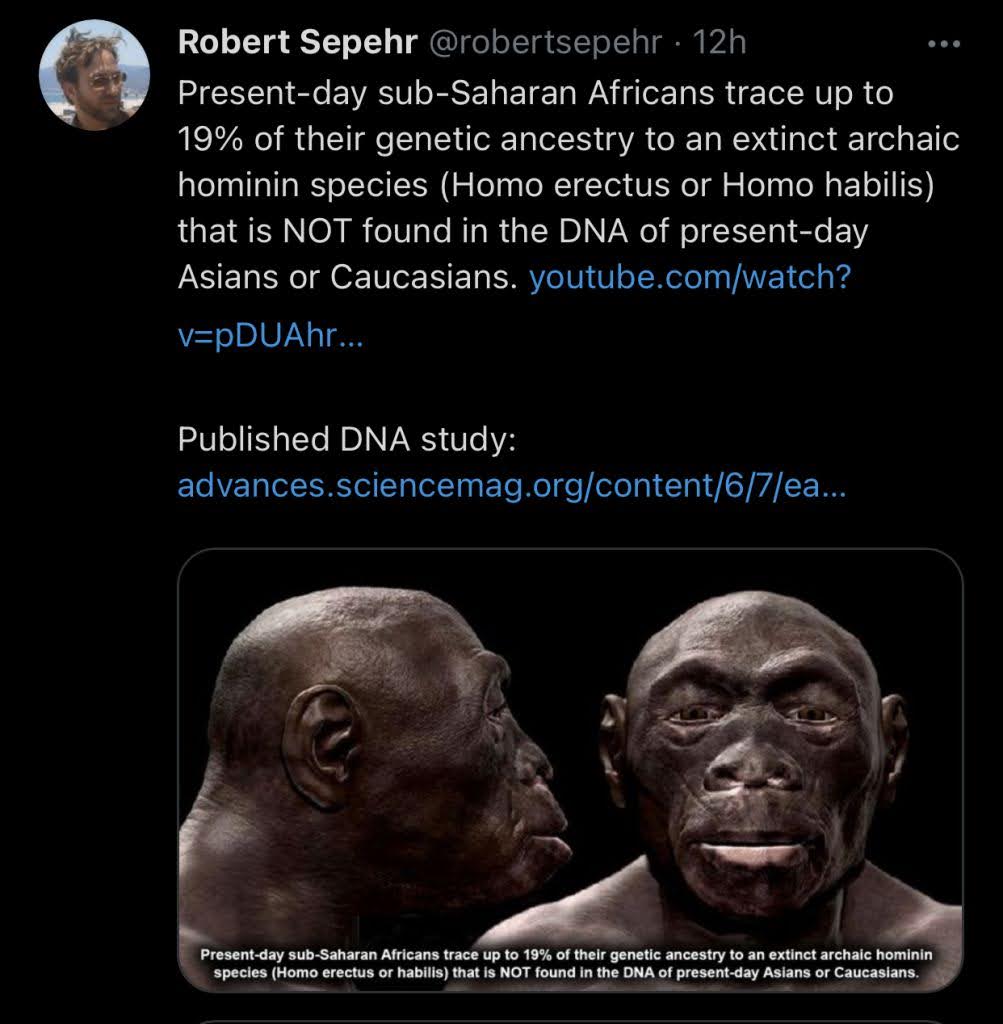 >>946857107I know, I've read the articles and the post is misleading. From the tip of my head: the article talks about ghost dna. It does not talk about homo erectus or homo habilis as being where that DNA came from. It's literally: we don't know. The tweet says "present day Sub-Saharan Africans" which is false, because it was a small group of Africans (in Nigeria iirc). The tweet was clearly more busy with painting a picture than providing factual data, So the point that you had to do a quick Google search and copy paste these articles without reading them proves my point. You took a literal screenshot of a twitter post as fact without doing proper research and now you look like a retard.