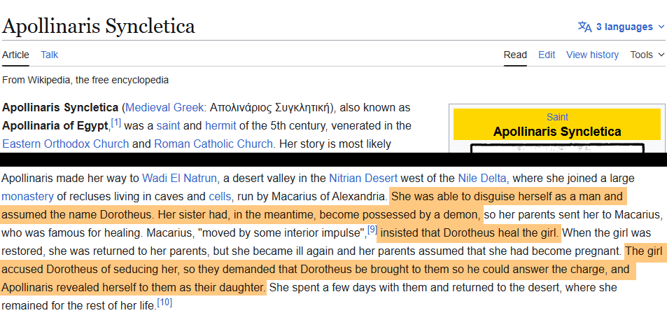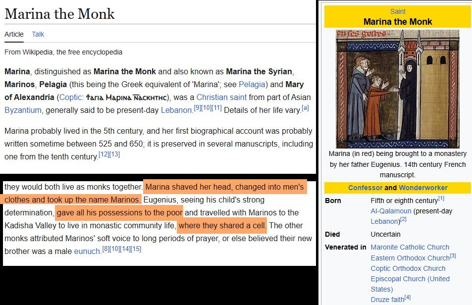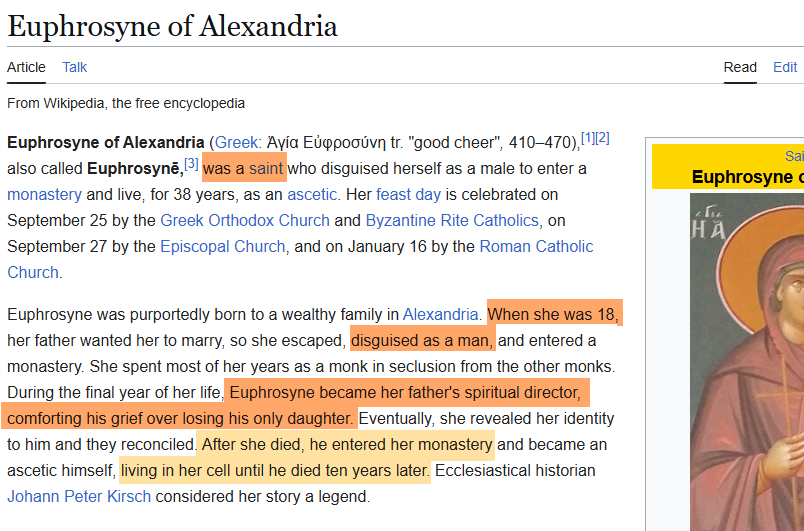 >>947066865Here's another Saint - officially canon. A woman cross-dressing as man.She hid in the place her father kept visiting and even comforted her own father over the loss of his daughter (herself).Despite living in a monastery where she was surrounded by highly educated men she remained a virgin for life.