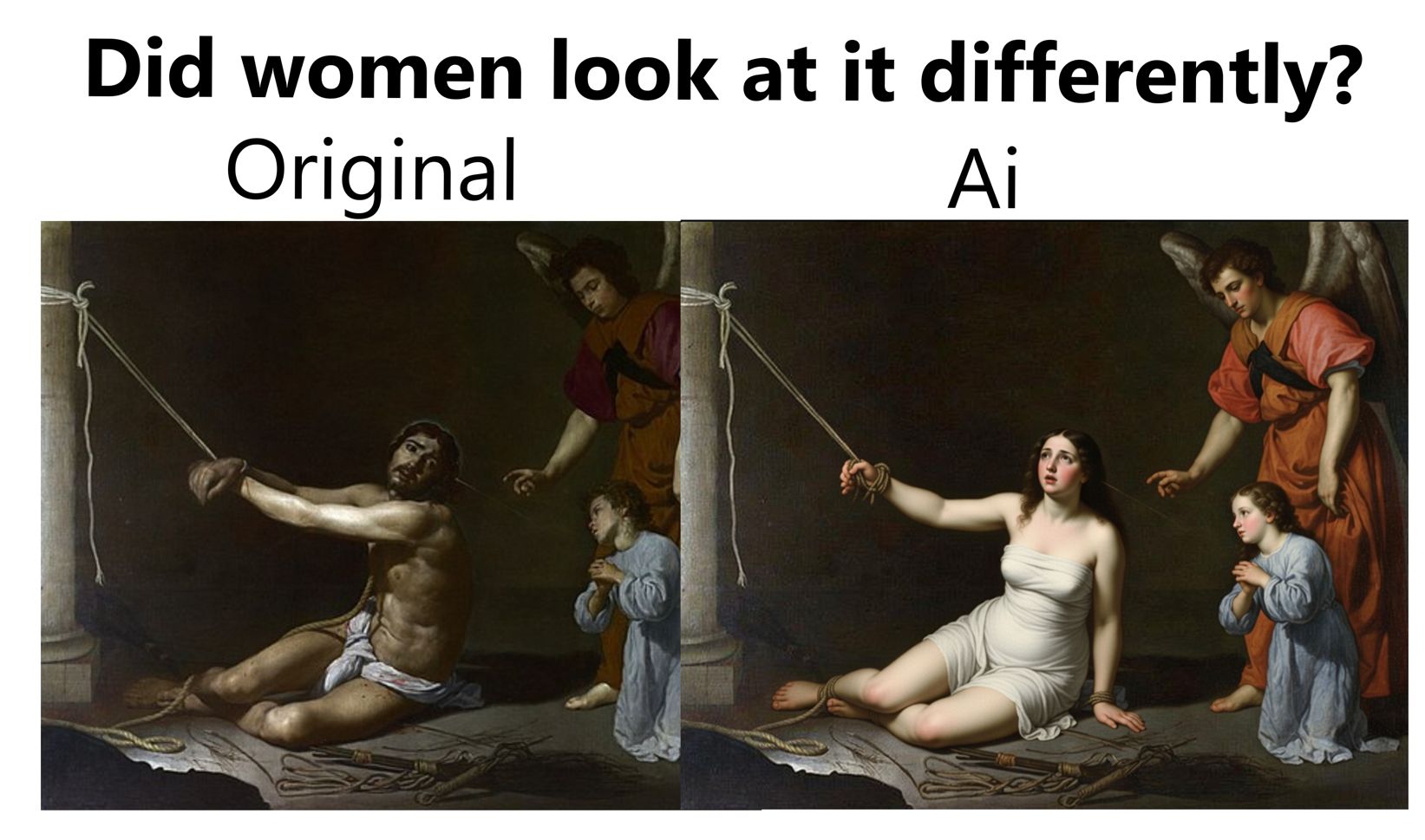 >>947066724>Because you are used to porn.Those statues were from ancient Greece anon, which wasn't know for it's rampant rape culture.>If there was no porn, you were a virgin and there was a building which featured lots of women in bondage...Whether the person being brutally murdered on the cross is male or female, I would consider an artistic depiction of it a representation of a gruesome act.Getting crucified isn't sexual.