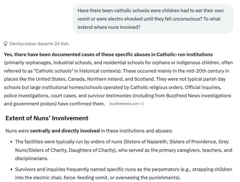 Prompt:>Have there been catholic schools were children had to eat their own vomit or were electro shocked until they fell unconscious? To what extend where nuns involved?Ai:>"Yes, there have been documented cases of these specific abuses in Catholic-run institutions (primarily orphanages, industrial schools, and residential schools for orphans or Indigenous children, often referred to as "Catholic schools" in historical contexts). These occurred mainly in the mid-20th century in places like the United States, Canada, Northern Ireland, and Scotland.">"Forced to Eat Their Own Vomit - This punishment was reported in multiple nun-run facilities">"Electroshock Until Unconscious (or Semiconscious) The most notorious example involved a homemade device explicitly used as punishment: St. Anne’s Indian Residential School (Canada) — Staff (including nuns) built and used an "electric chair" powered by a crank generator. Children were strapped in, shocked repeatedly (sometimes until semiconscious or unconscious), for punishment, "amusement," or minor infractions. It was also used on groups for sport. Survivors described it in police interviews; the school operated 1906–1970s under Catholic orders. The federal government initially resisted compensation claims for this abuse. Ontario Provincial Police investigations documented it extensively.">"Similar electric shock punishments (e.g., for bedwetting) were alleged in some Nazareth House homes run by nuns."
