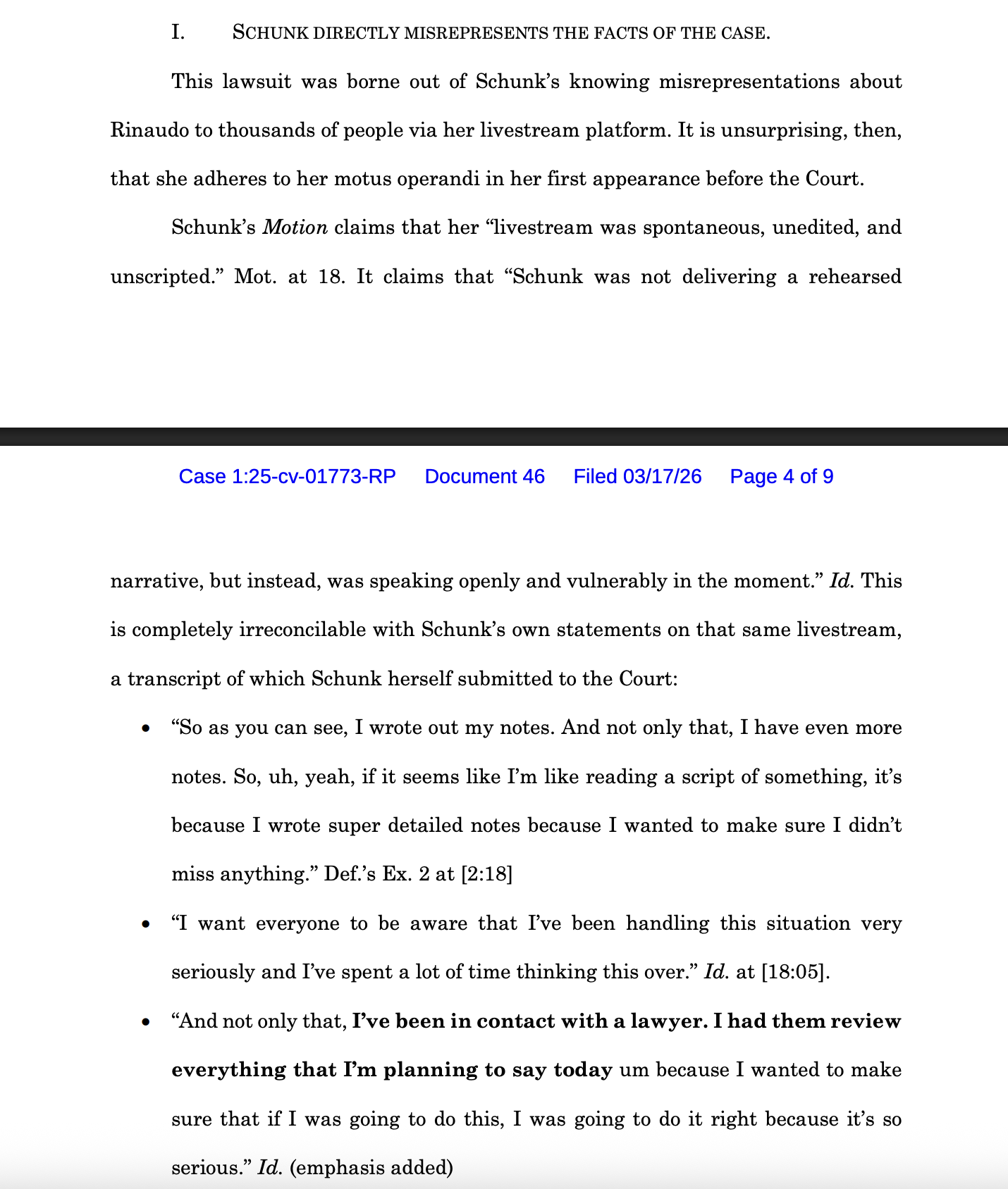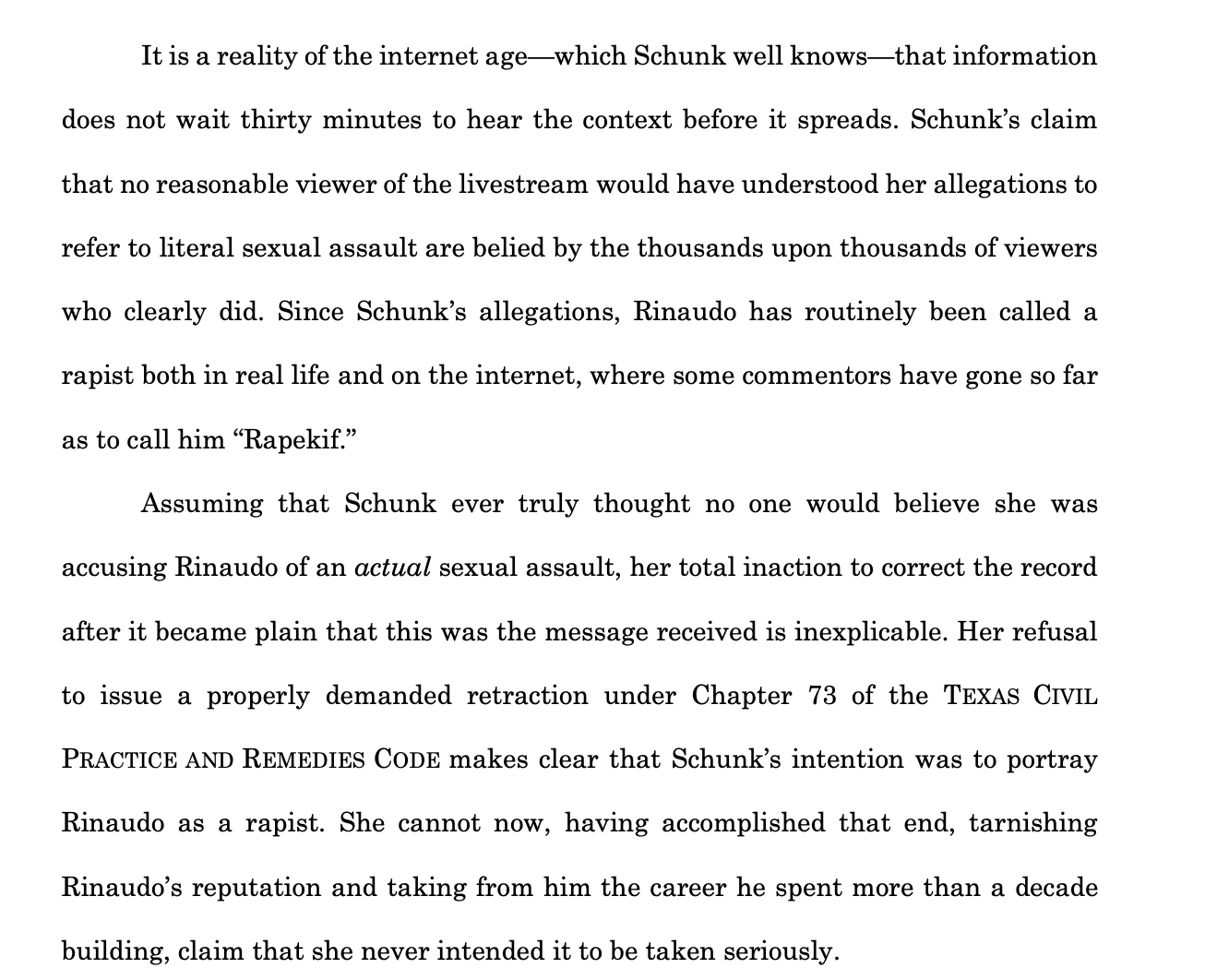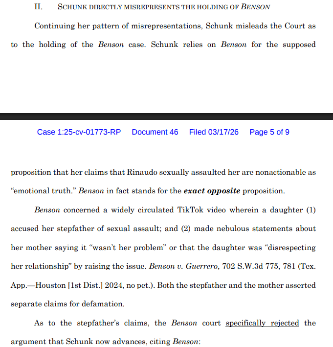 >>947071550its an extremely weak response to her motion to dismiss> Here, Rinaudo has provided a detailed and itemized list of statements andincluded information concerning who made them, via what medium, and on whatdate. He has provided the content of the statements. He has even providedtimestamps where the statements can be located. Schunk cannot seriously contendthat she is unable to respond to the suit.He did nothing of the sort. All his claims were complete bs and there was no specific claim that would stick. the best they could state to be defamatory is her mentioning 'sexual assault' three times but there is not a specific line they can state that is defamatory esp since the thing she described that falls under the SA umbrella he agreed happened