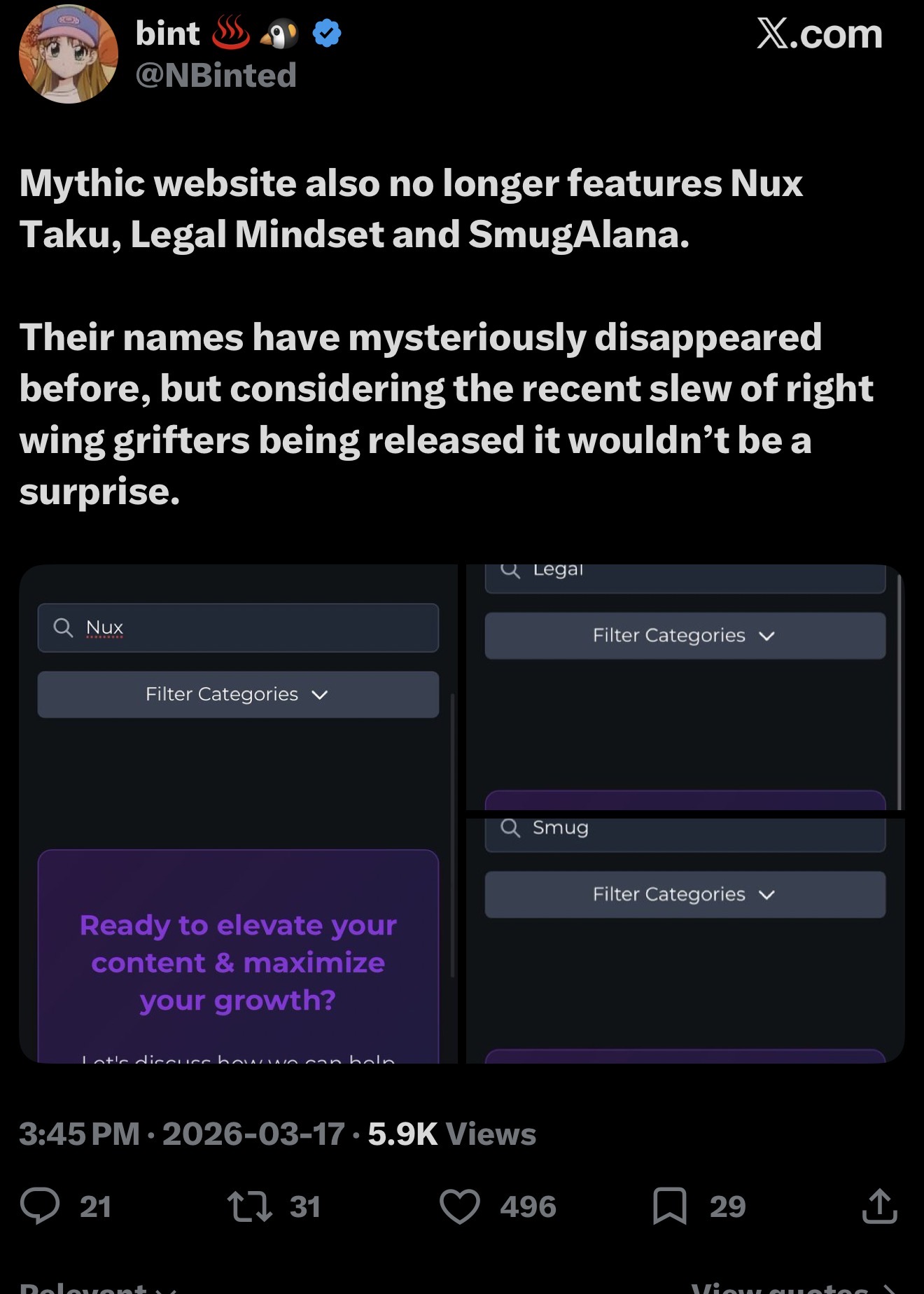 >>947068730cinna, nora, bonnie, asmon, esfand and dead miz