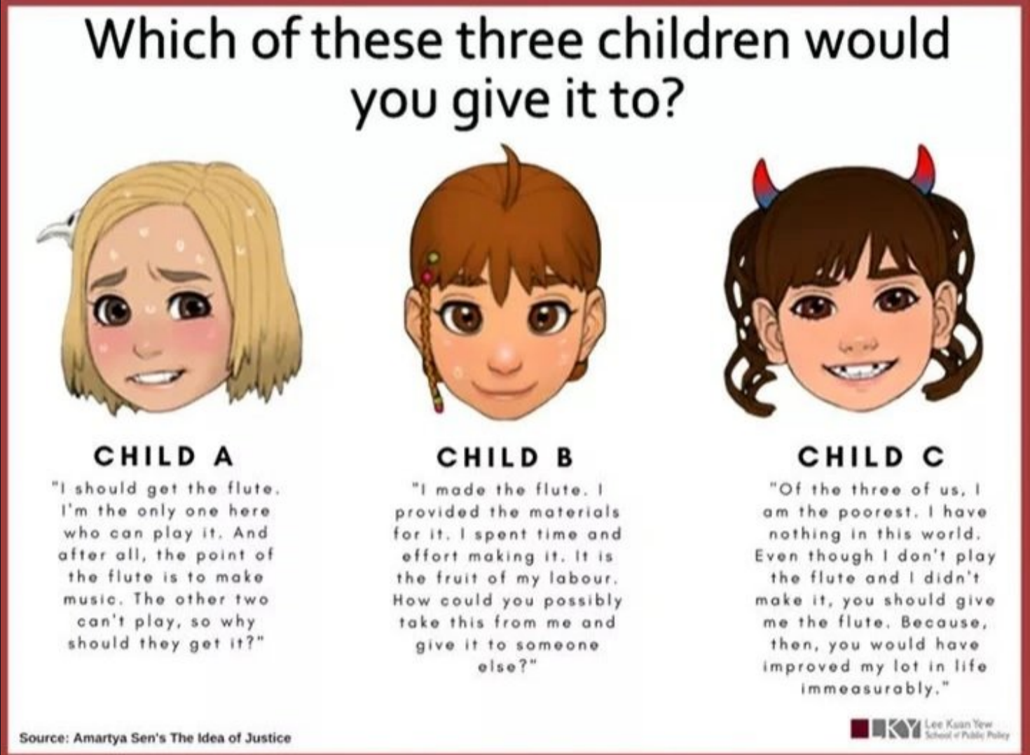 Child B. It is their creation and the result of their skill, effort, and resources. To deprive them of it is needless theft.Child C uses a fallacious argument. Its a flute. Unless they are a remarkably skilled flute player owning it is unlikely to benefit them in any way more significant than receiving a new toy or low cost luxury item. If they are so poor they should be looking for charity instead.Child A has a point but its not as if Child B is incapable of learning or having their own purpose for the flute. In addition its not as if the flute is an essential item that they are in need of.