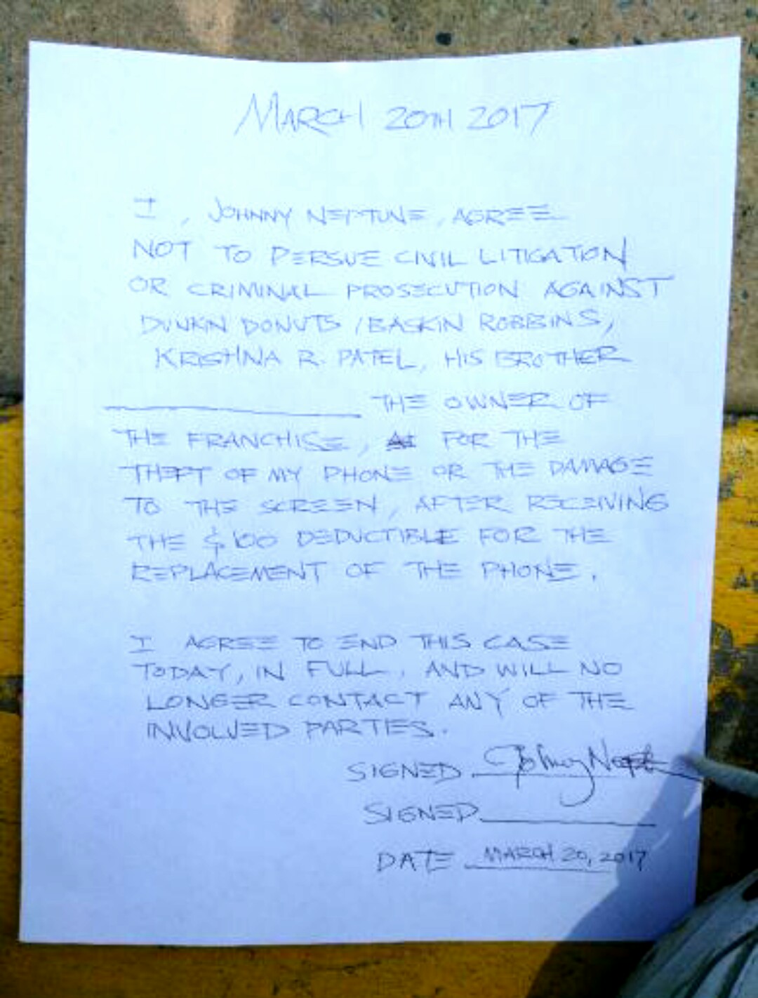 So that was March 4th 2017for the next 2 weeks I tried reasoning with the eastern Indian franchise owner, Mr. PatelBut he refused to even listen... "You got your phone back" he said it over and over and over "you got your phone back""BUT YOUR EMPLOYEE SHATTERED THE SCREEN TO MY PHONE"I started off being very professional and polite and courteous, but as each day passed, he continued being a dick, and I finally reached the point where I BEGAN INSULTING EASTERN INDIANS(pay attention: the REAL reason I was arrested was because my insults to eastern indians)I told him "considering how you filthy animals bathe and brush your teeth in the Ganges River with ROTTING CORPSES floating past you, it's easy to understand why you paint little red targets between your eyes"And THAT pissed him off(Also, I didn't realize his brother was a lieutenant at the sheriff's department)