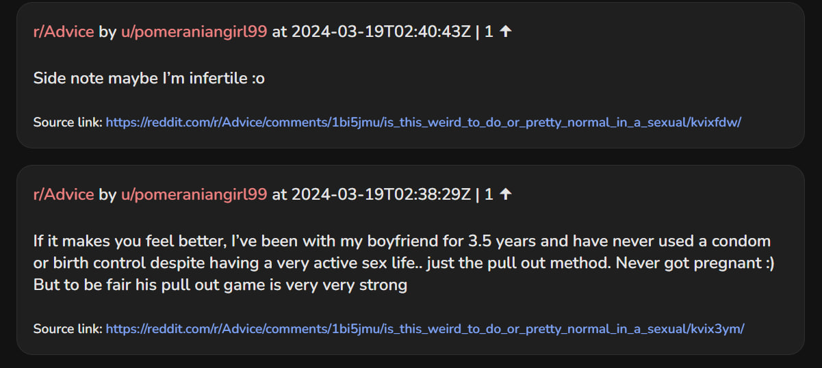 >>947314438that comment about having very active sex life and how she was getting dicked exclusively without condoms and bc is so hot for some reason, wish there was more comms like this