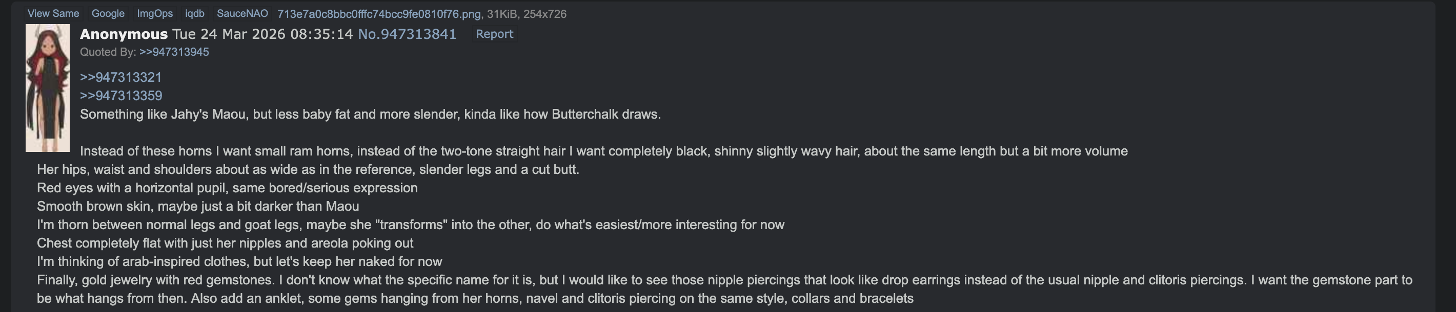 >>947343906I'll doShould I specify that character I'm referencing or should i build her from zero?