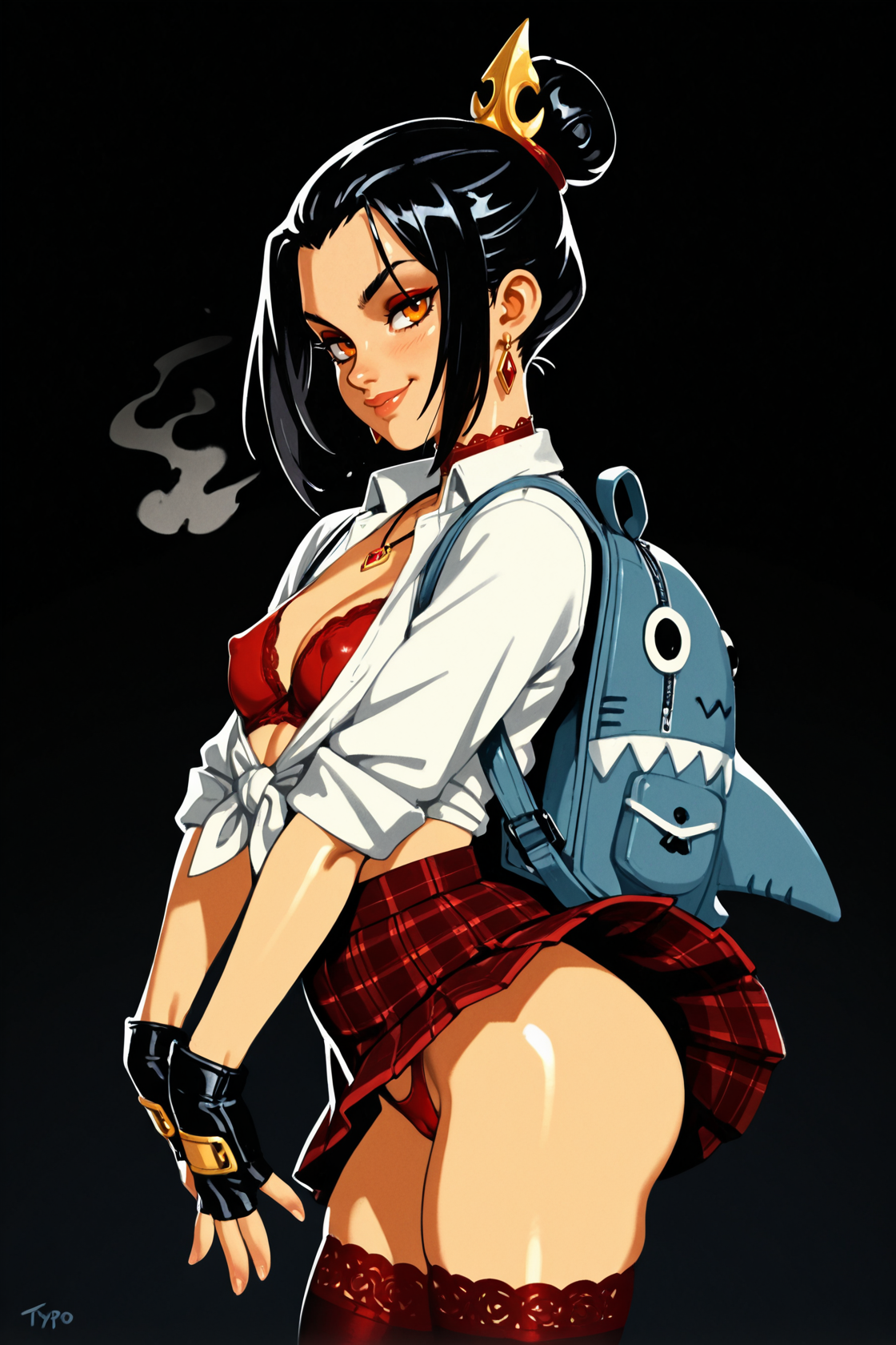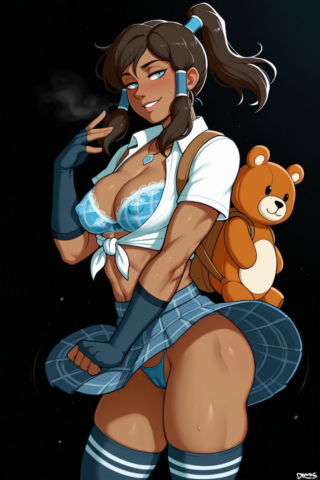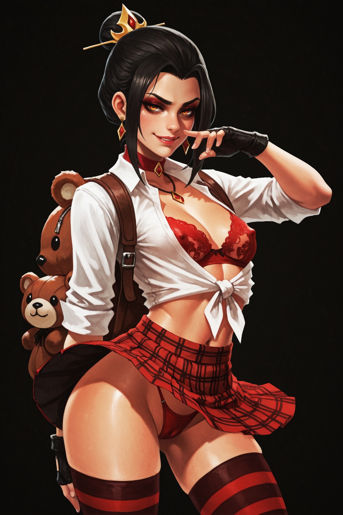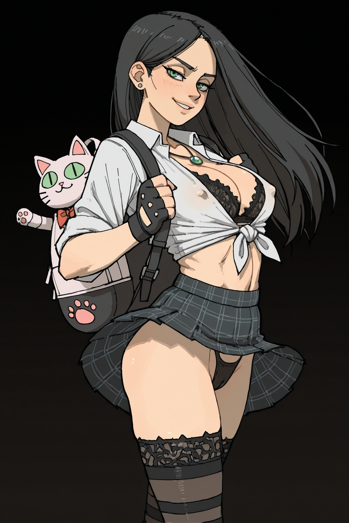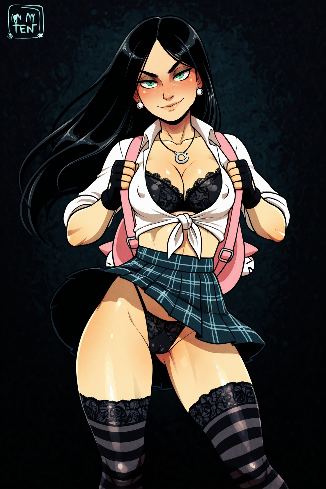 nsfw, dark background, 1girl, {azula, black hair, single hair bun, amber eyes, hair ornament, sidelocks, shark bag, choker, small breasts, ,petite, red|korra, brown hair, ponytail, hair tubes, medium breasts, blue eyes, dark-skinned female, (toned:0.5), bear bag, blue|laura kinney, green eyes, black hair, long hair, petite, (toned:0.5), cat bag, black} lace bra, necklace, earrings, seductive smile, in heat, , white shirt, tied shirt, cleavage, school uniform, tight clothing, plaid skirt, animal bag, , backpack, stripped stockings, coy smile, fingerless gloves, erotic pose, wind lift, thong,, standing, looking at viewer, , covered nipples, cameltoe, suggestive, dynamic pose, erotic pose, {by khyle|by pantsu-ripper|by owler|by monori rogue|by 2dswirl|by john doe|by evulchibi|by ishikei|by andava|by randomboobguy|by optionaltypo|by my pet tentacle monster|by kink \(tortoiseshell\)|by queen complex|by dross|by joel jurion}, , {side view, from side, {groin|ass}|dynamic angle}