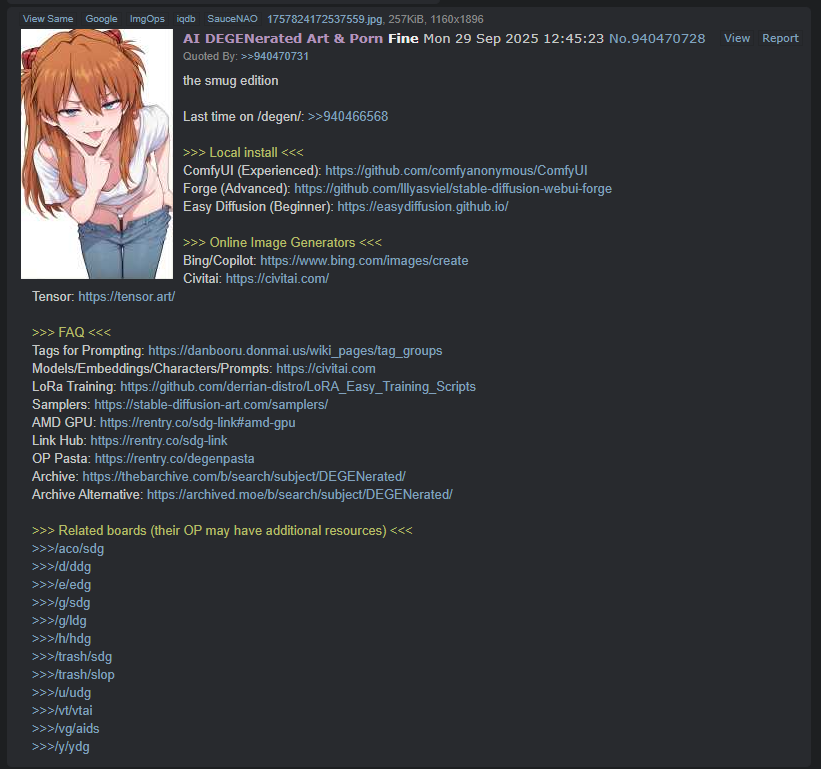 Collage editionPrevious: >>947444785>>> Local install <<<ComfyUI (Experienced): https://github.com/comfyanonymous/ComfyUIForge (Advanced): https://github.com/lllyasviel/stable-diffusion-webui-forgeEasy Diffusion (Beginner): https://easydiffusion.github.io/>>> Online Image Generators <<<Bing/Copilot: https://www.bing.com/images/createCivitai: https://civitai.com/Tensor: https://tensor.art/ (SFW) || https://tensorhub.art/ (NSFW)Pixai: https://pixai.art/Grok: https://grok.com/imaginePerchance: https://perchance.org/generators>>> FAQ <<<Tags for Prompting: https://danbooru.donmai.us/wiki_pages/tag_groupsMore tags & Prompts: https://www.downloadmost.com/NoobAI-XL/danbooru-character/Models/Embeddings/Characters/Prompts: https://civitai.comLoRa Training: https://github.com/derrian-distro/LoRA_Easy_Training_ScriptsSamplers: https://stable-diffusion-art.com/samplers/AMD GPU: https://rentry.co/sdg-link#amd-gpuLink Hub: https://rentry.co/sdg-linkOP Pasta: https://rentry.co/degenpastaArchive: https://thebarchive.com/b/search/subject/DEGENerated/Archive Alternative: https://archived.moe/b/search/subject/DEGENerated/>>> Related boards (their OP may have additional resources) <<<>>>/aco/sdg>>>/d/ddg>>>/e/edg>>>/g/sdg>>>/g/ldg>>>/h/hdg>>>/trash/sdg>>>/trash/slop>>>/u/udg>>>/vt/vtai>>>/vg/aids>>>/y/ydg