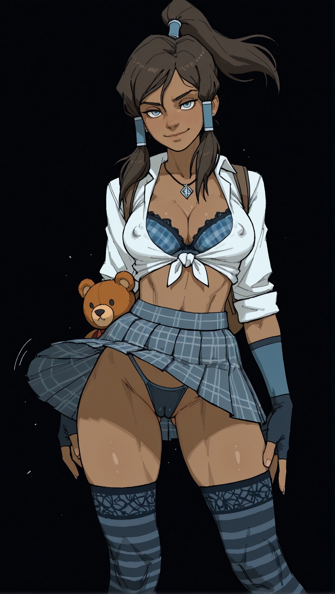 nsfw, dark background, 1girl, {azula, black hair, single hair bun, amber eyes, hair ornament, sidelocks, shark bag, choker, small breasts, ,petite, red|korra, brown hair, ponytail, hair tubes, medium breasts, blue eyes, dark-skinned female, (toned:0.5), bear bag, blue|laura kinney, green eyes, black hair, long hair, petite, (toned:0.5), cat bag, black} lace bra, necklace, earrings, seductive smile, in heat, , white shirt, tied shirt, cleavage, school uniform, tight clothing, plaid skirt, animal bag, , backpack, stripped stockings, {coy smile|seductive smile}, fingerless gloves, erotic pose, wind lift, thong,, standing, looking at viewer, , covered nipples, cameltoe, suggestive, dynamic pose, erotic pose, {by khyle|by pantsu-ripper|by owler|by monori rogue|by 2dswirl|by john doe|by evulchibi|by ishikei|by andava|by randomboobguy|by optionaltypo|by my pet tentacle monster|by kink \(tortoiseshell\)|by queen complex|by dross|by joel jurion}, , {side view, from side, {groin|ass}|dynamic angle}