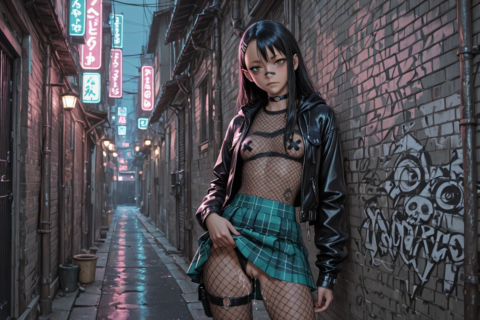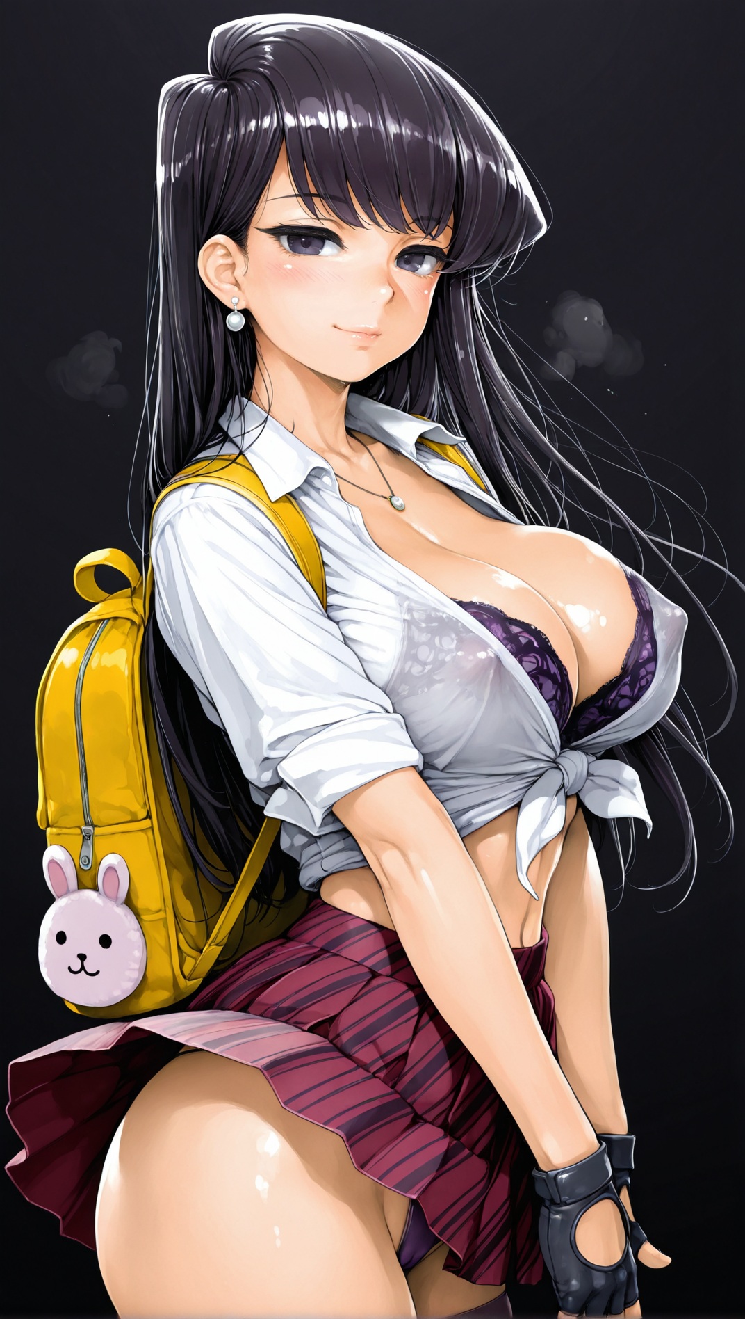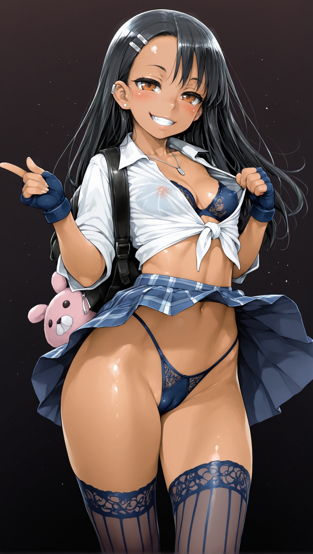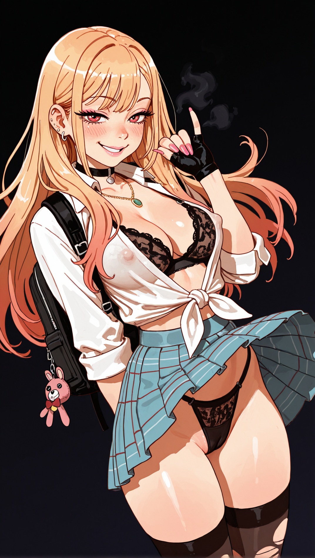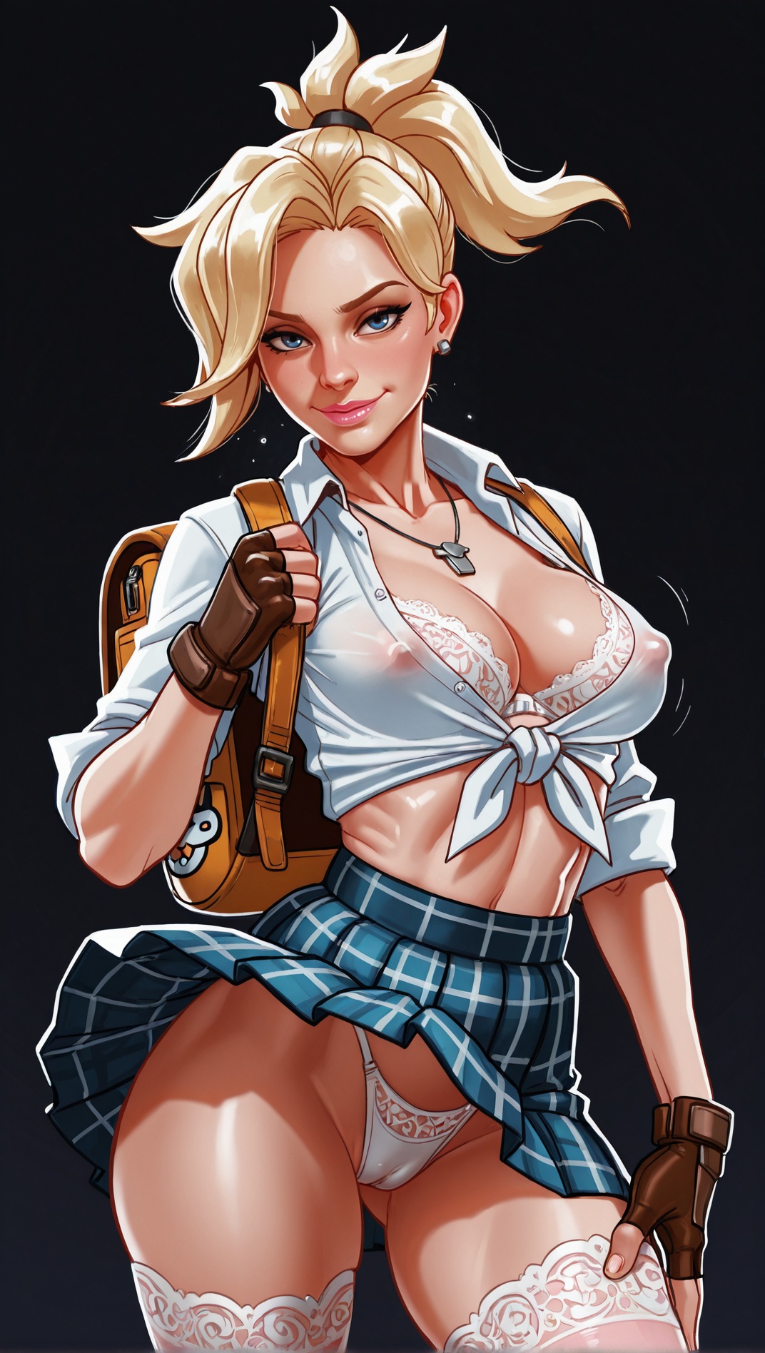 >>947494509nsfw, dark background, 1girl, starfire, dc comics, 1girl, orange skin, green eyes, red hair, long hair, medium breasts, green sclera, pink lace bra, necklace, earrings, seductive smile, in heat, , white shirt, tied shirt, cleavage, school uniform, tight clothing, plaid skirt, animal bag, , backpack, stripped stockings, coy smile, fingerless gloves, erotic pose, wind lift, thong,, standing, looking at viewer, , covered nipples, cameltoe, suggestive, dynamic pose, erotic pose, by joel jurion, , dynamic anglemodify this and ask in next thread