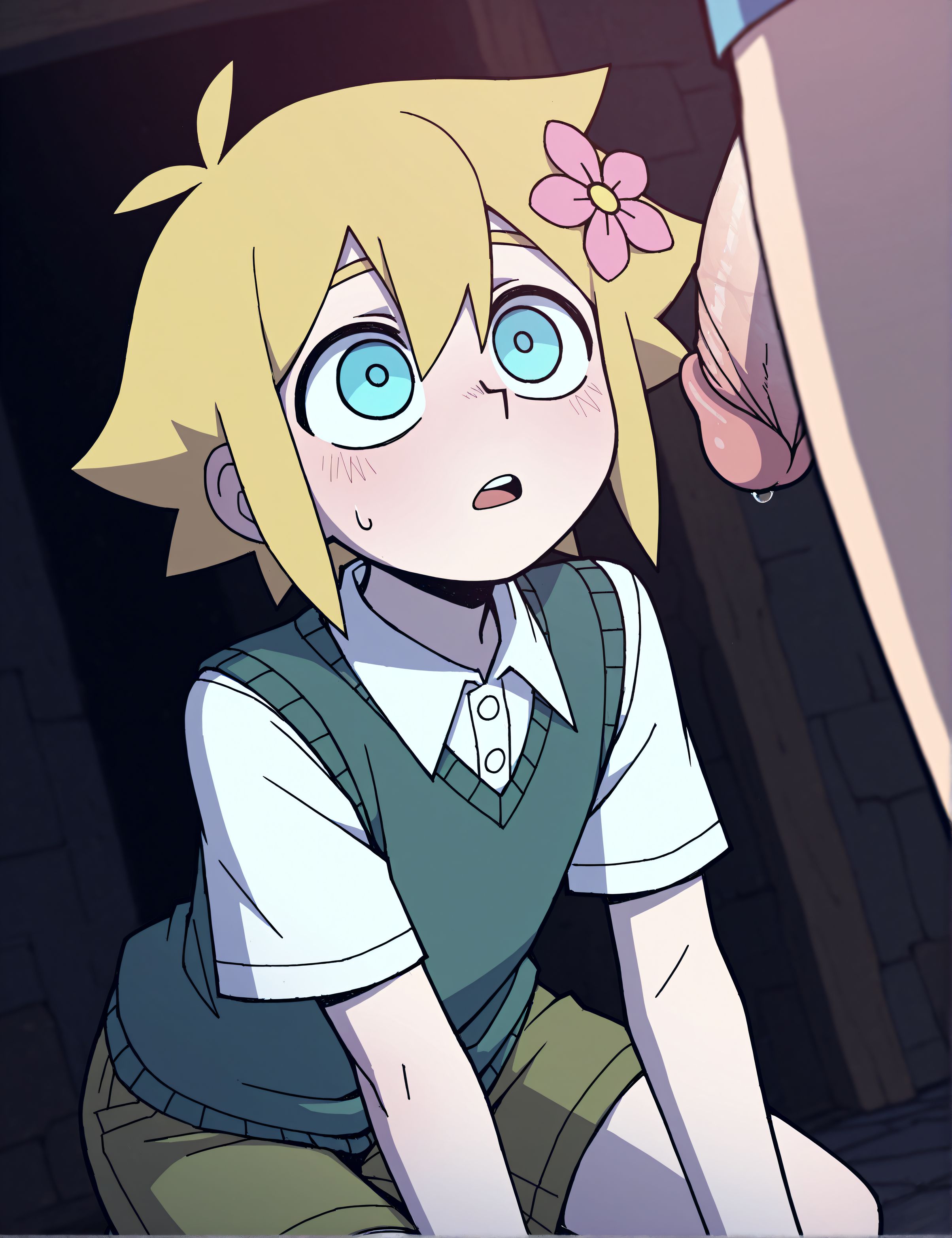 >>947497266I feel like you gotta keep the more prominent parts of character design when you go this far off model. After all, I wouldn't want some poor anon to jerk off to her without knowing he's a boy, and turning gay