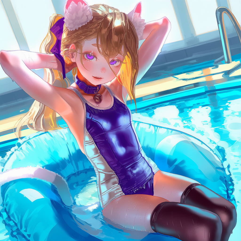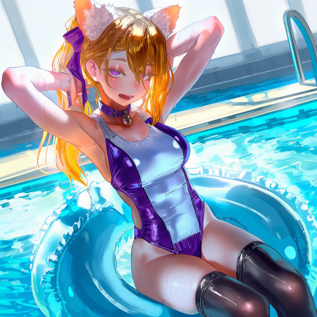 A cat that doesn't mind the waterAlso, requesting girls in thighighs + swimsuit