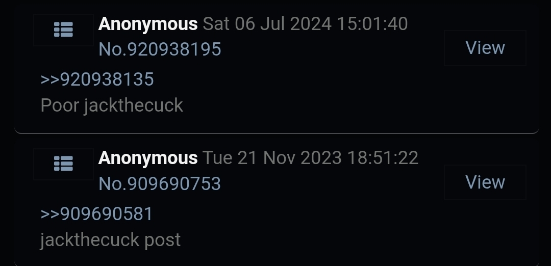 >>947664995>Lmao "one-off" cope doesn't work when jackthecuck was posted for months before you typing in Nov 2024So you are a retarded pajeet lmao. You are lying now and have to cope. It was a one off for months and Jackthecuck came in July 2024 and spammed for months. Eventually got annoying and anons responded with Jackthechad which triggered the cuck poster. The shitskin is going to respond with more cope but it is clear that he is desperate after getting exposed as the cuck poster.