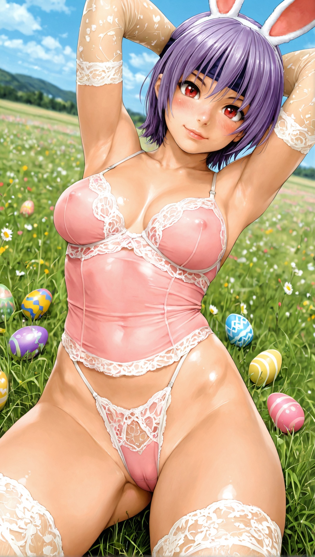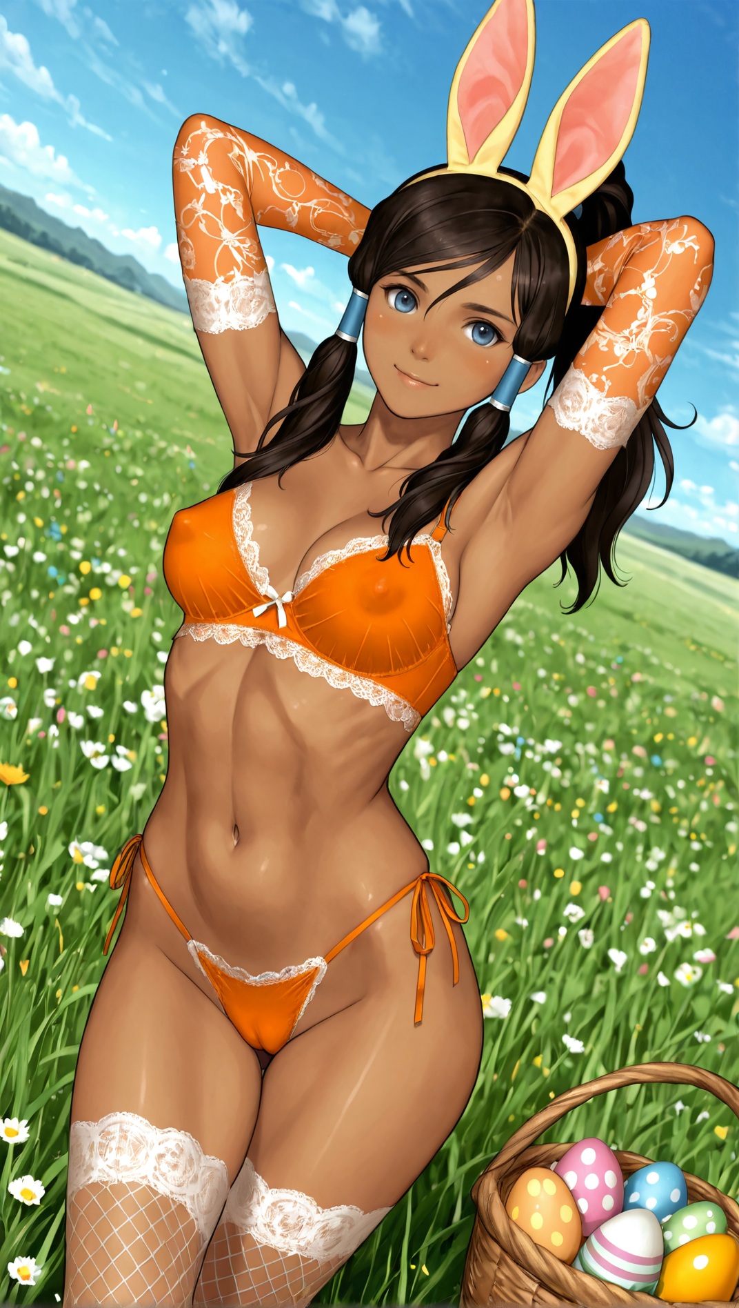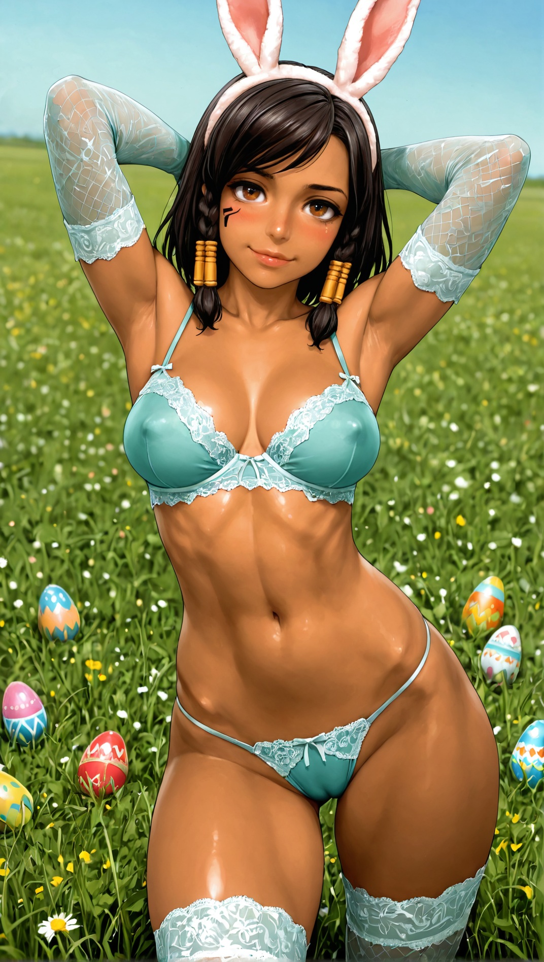 1 girl, lisa hamilton, dead or alive, 1girl, dark-skinned female, very dark skin, lips, brown eyes, short hair, brown hair, large breasts, thighs, {white|pink|aqua|purple|orange|yellow}lace elbow gloves, lace stockings, rabbit ear headband, highleg lace thong, lace bra, covered nipples, (cameltoe:0.7), aroused, {hands behind head, arms up|adjusting hair|grabbing own breasts, deep skin|pinup pose|waving hand, goodbye|contrapposto, pinup pose|kneeling, spread legs}, {smile|coy smile|smug smile|seductive smile|parted lips, tilted head} easter, green field, spring, easter eggs, blue sky, meadow, , {side view, from side|dynamic angle}, {by khyle|by pantsu-ripper|by owler|by monori rogue|by 2dswirl|by john doe|by evulchibi|by ishikei|by andava|by optionaltypo|by my pet tentacle monster|by kink \(tortoiseshell\)|by queen complex|by dross|by joel jurion},, , dynamic pose, blush,