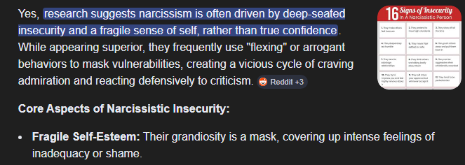 >>947745290retard i just used ai to prove an obvious point. you can read however many literature books you want about narcissism they will all say theyre insecure