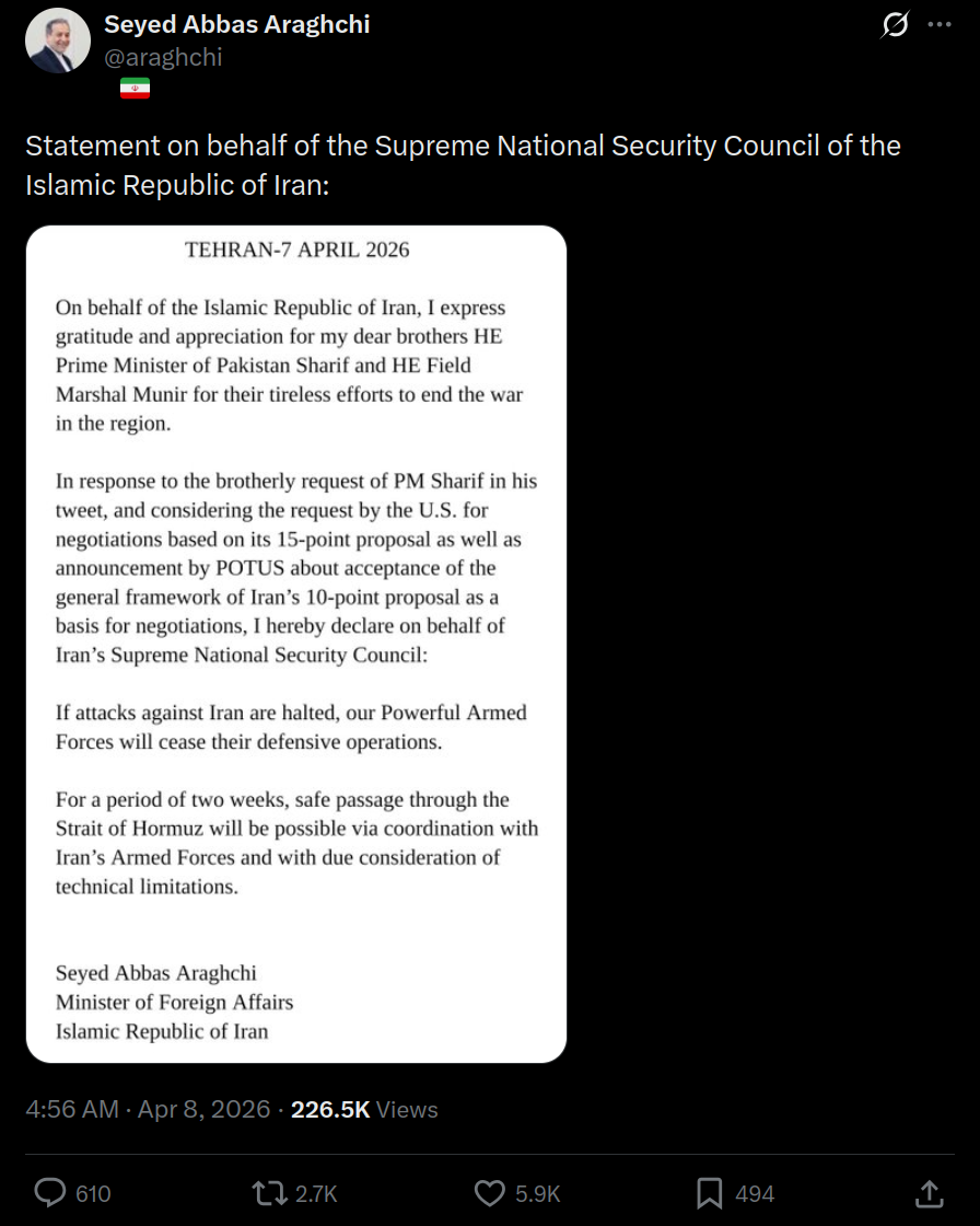 there you, Iran official statementthe strait is openedyou decide who wonhttps://x.com/araghchi/status/2041655156215799821