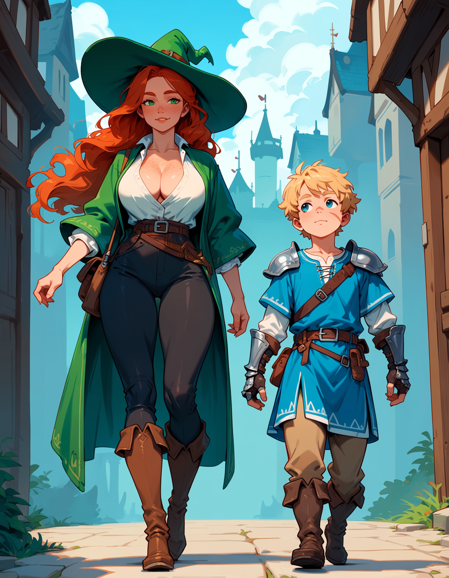 Dude anima is fucking good holy shit! This was all just a prompt, no regionalprompting or fucking with the image after. Check out this simple prompt:>masterpiece, best quality, score_9, sensitive.>A little boy and a teenage girl walking through a medieval city.>The teenage girl has red hair, green eyes, freckles on her face and body, large breasts, and a toned build. She is wearing a green witch hat, green robe, white blouse, and black trousers.>The little boy has blonde hair, blue eyes, and a scar on his face. He is wearing a blue tunic, brown trousers, pauldrons, and gauntlets.>height_difference...and it just fucking worked. No mixups between the characters! Mind blowing to think how far we've come