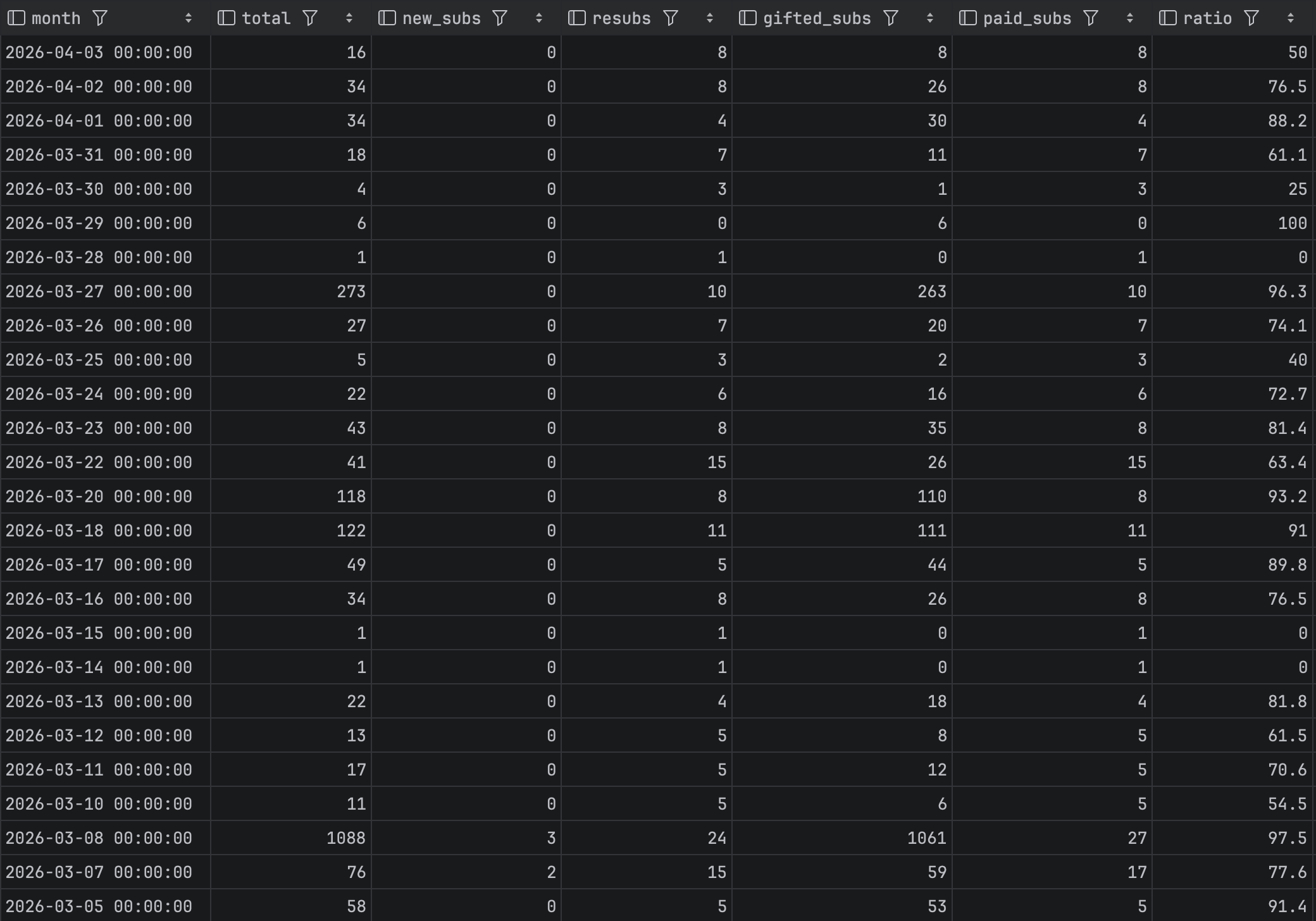 >>947875607didnt she drop to 1.5k a couple of weeks ago and cry about it and get gifted 700 subs lolshe has a huge drop incoming