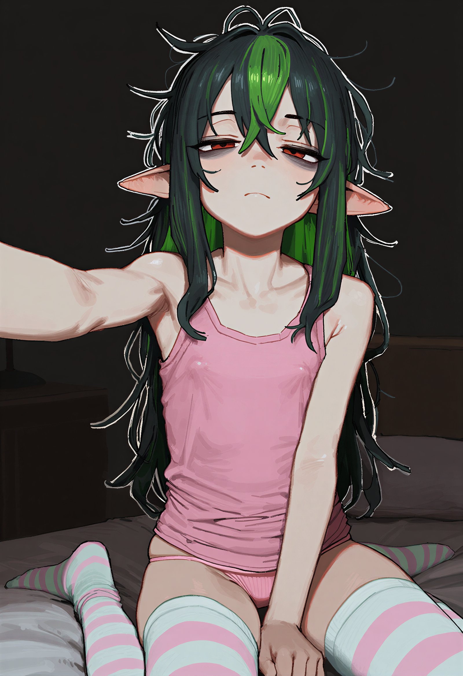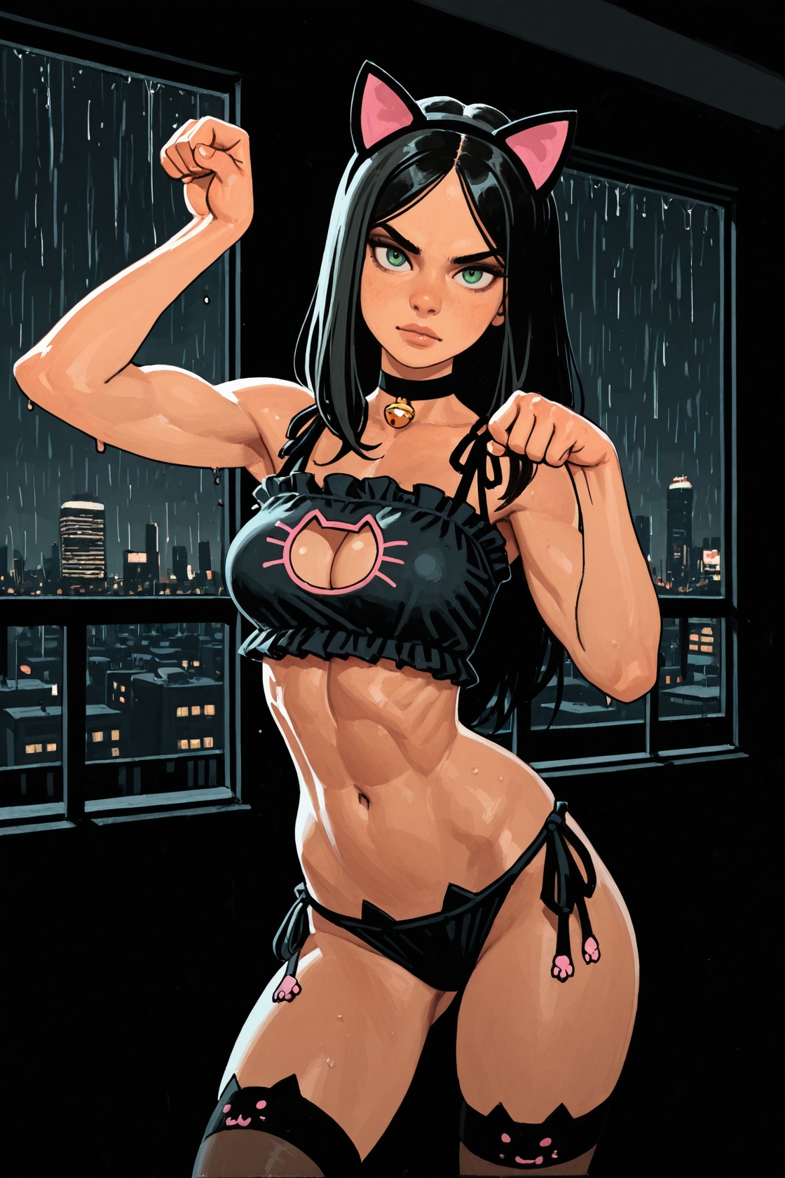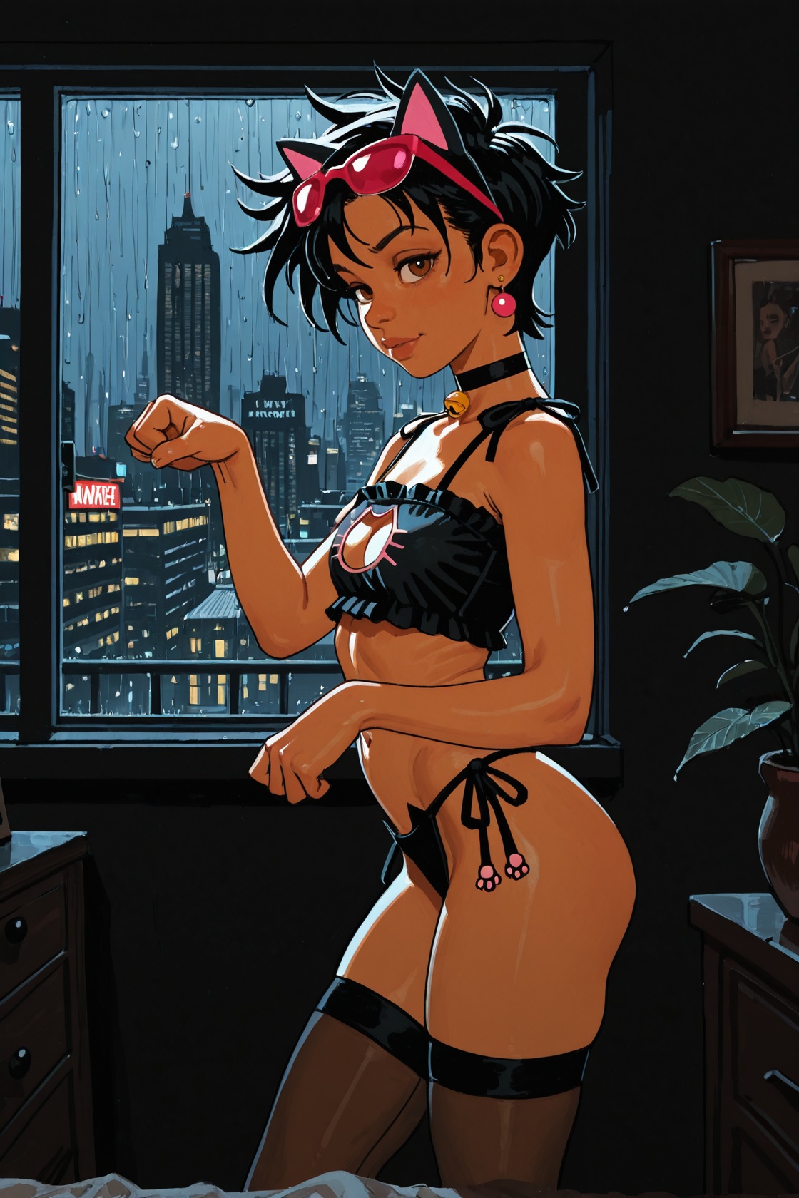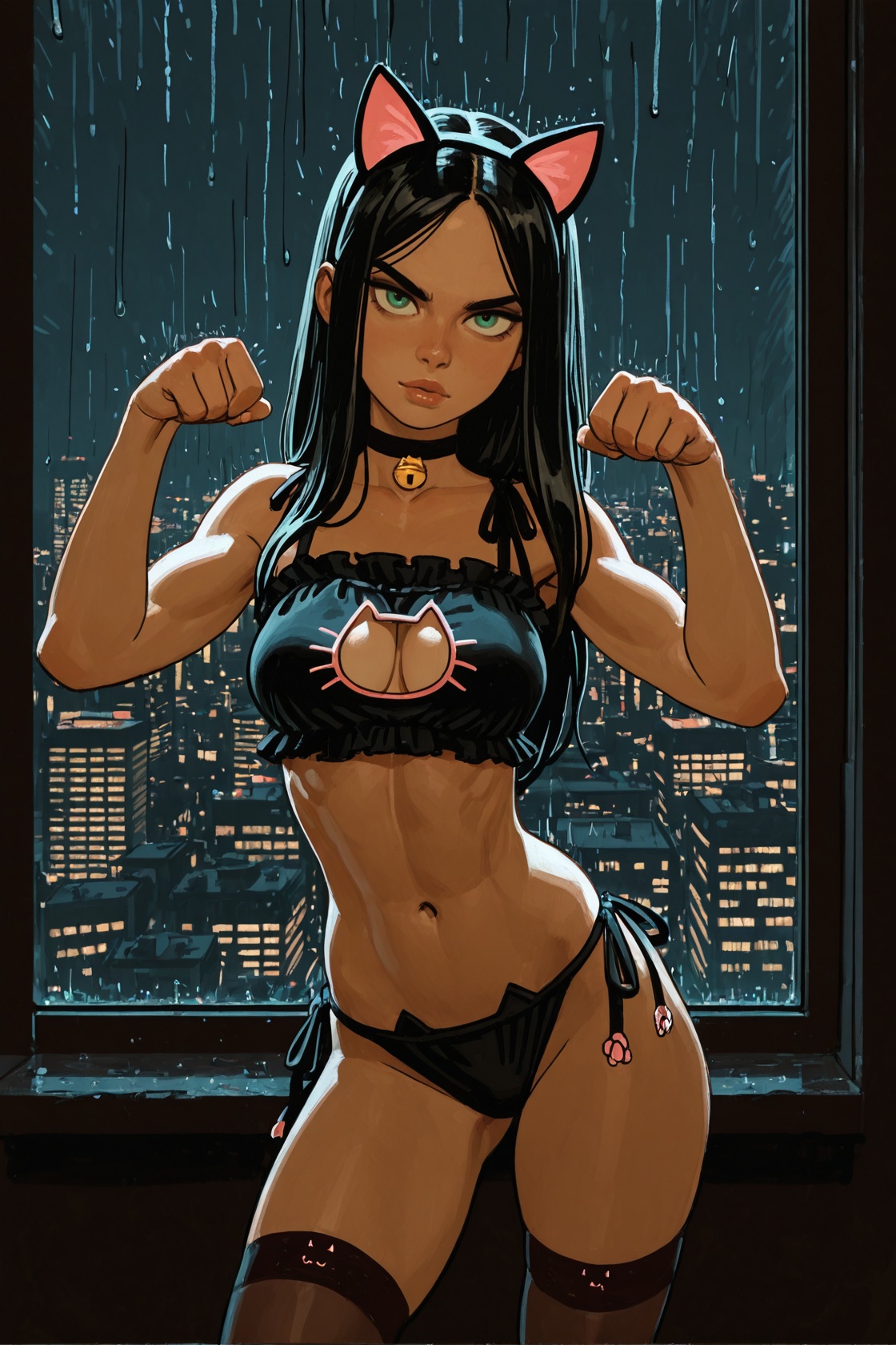 >>947882323headbands sometimes prompt across the forehead, gotta go with hairband1 girl, laura kinney, green eyes, long hair, black hair, petite, (toned:0.6), medium breasts, slender, cat ear hairband, cat lingerie, stockings, choker, cat pose, contrapposto, indoors, apartment, dark background, new york city, cityscape, large windows, by joel jurion, (by pantsu-ripper:0.6), looking at viewer, modeling, come hither, rain outside, girly pose, seductive