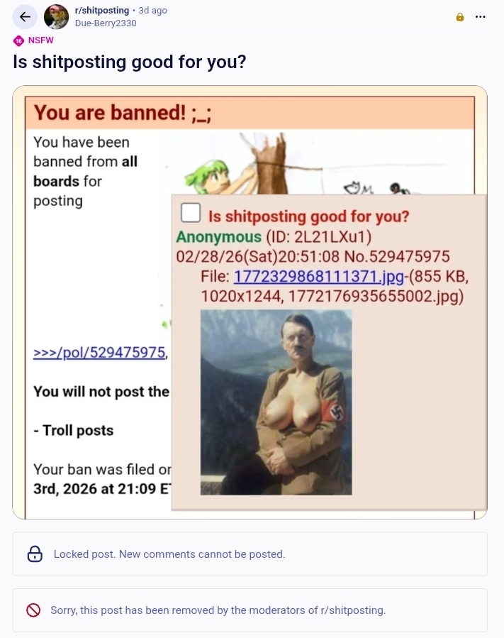 >>947886059used to be folks sharing things they found and liked or thought were funny. was great. then folks started to not like it so you saw spam of bananas and dumb shit and as the politics took over, you find no laughs, no humor. No fun. I think people think trolling retard trolls is somehow funny, but any anger is performative and fake, because they think they are trolling you by pretending to be angry, so now it's just that thing where none of the monkeys remember those hose or the bananas, they just keep hammering each other because that's all they do.
