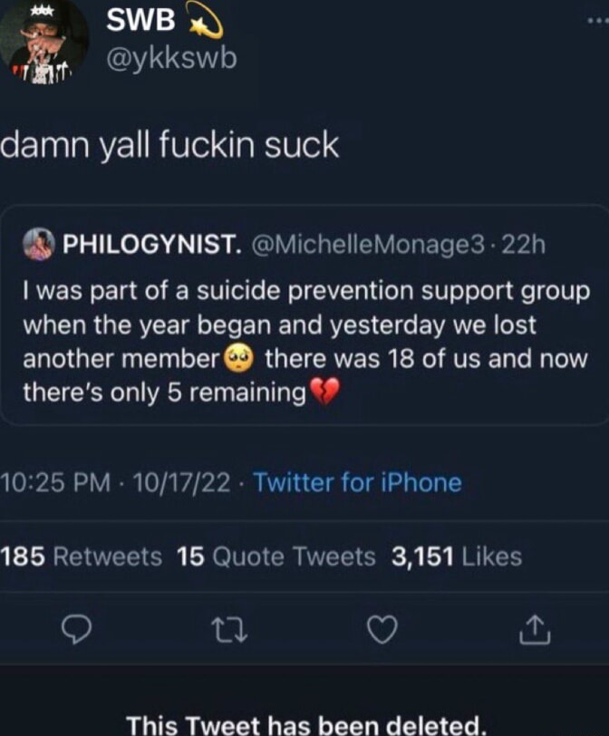 It just kinda seems like lucifer made this entire thread. One of his jokes is that he brainwashes humans to make them produce more money. But, that it’s not actually brainwashing anything, it’s just one of his jokes. So like every meme in this thread is lucifer humor, as it’s all 100% designed to brainwash you or manipulate you emotionally. And that, so listen. The point of it is that it earns money when you do stuff like that. Like imagine the difference basically of a gym where you go to work out. And, now put the message “you’re very ugly and won’t ever have sex” there on the mirrors. Youll just feel like worse about yourself I guess, so that’s like the theory about why lucifer finds it so funny. Alright but the counter theory is that almost nobody even needs to read anything, as they are lucifer already and doesn’t need to read something to know about it. So that’s why “lucifer is brainwashing people for profit” is a funny joke kinda. I dunno if I repeated myself a lot, I’m pretty sure nobody but me is real. Lucifers in my actual house with me and has been touching my penis, he gores my penis every day and I can’t get him to leave.