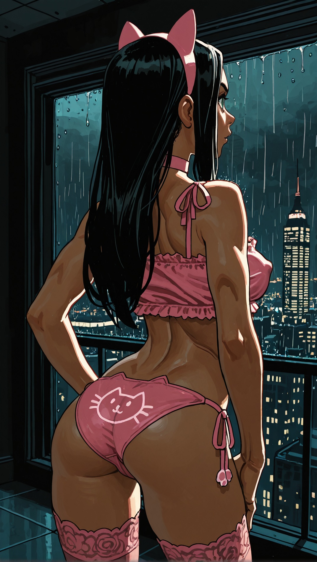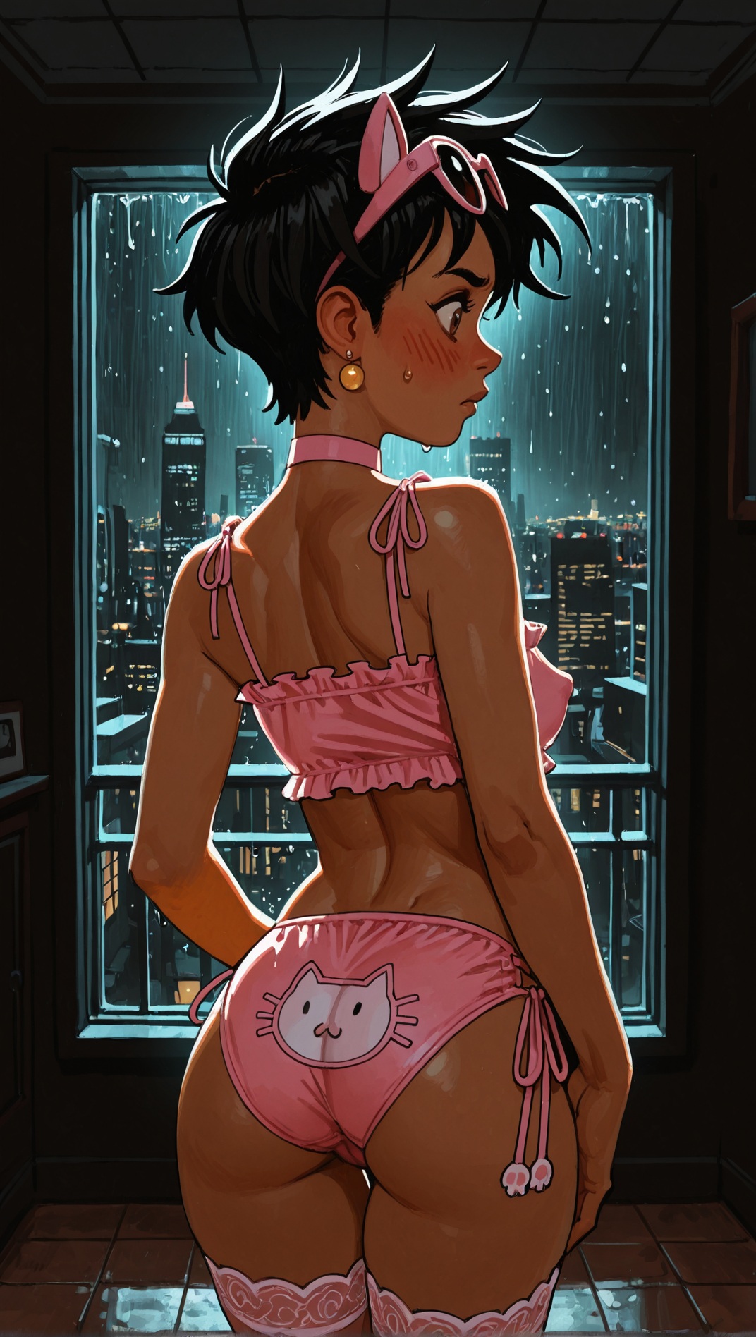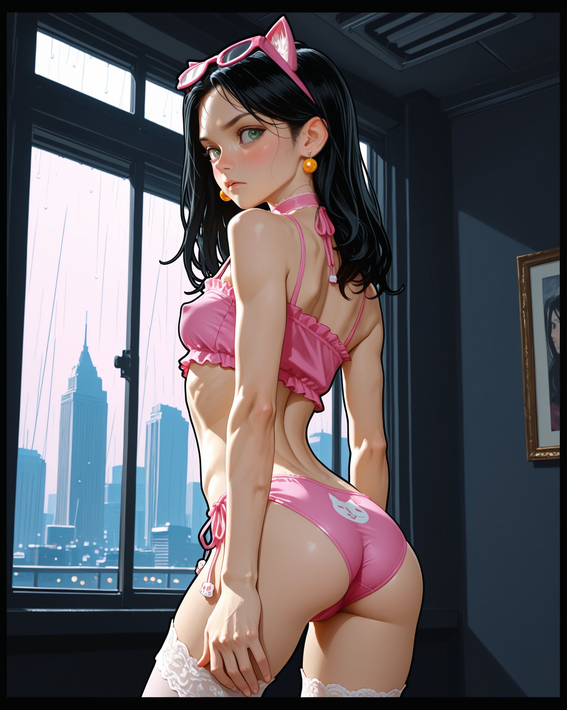 >>9479059701 girl, solo, elegant, {laura kinney, green eyes, long hair, black hair, petite, (toned:0.6), medium breasts, slender, aqua and pink lace trim|jubilee, marvel, 1girl, brown eyes, eyewear on head, black hair, short hair, small breasts, earrings, spiked hair, slender, yellow and pink lace trim}, cat lingerie, cat ear hairband, stockings, choker, indoors, penthouse, dark background, new york city, cityscape, ((large windows)), floor to ceiling windows, by joel jurion, (by pantsu-ripper:0.6), {looking at viewer, modeling, pinup pose|candid, looking afar, looking ahead, modeling, pinup pose|looking to the side, suprised, blush, flustered, caught, embarrassed, crack of light, (sidelighting)}, , rain outside, covered nipples, (cameltoe:0.8), aroused, {dynamic angle|side view, from side|rear view, from behind}, backlighting