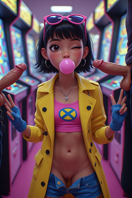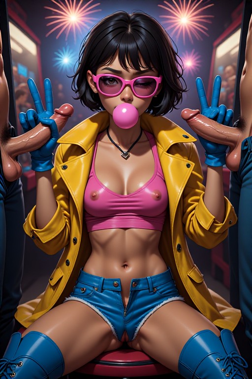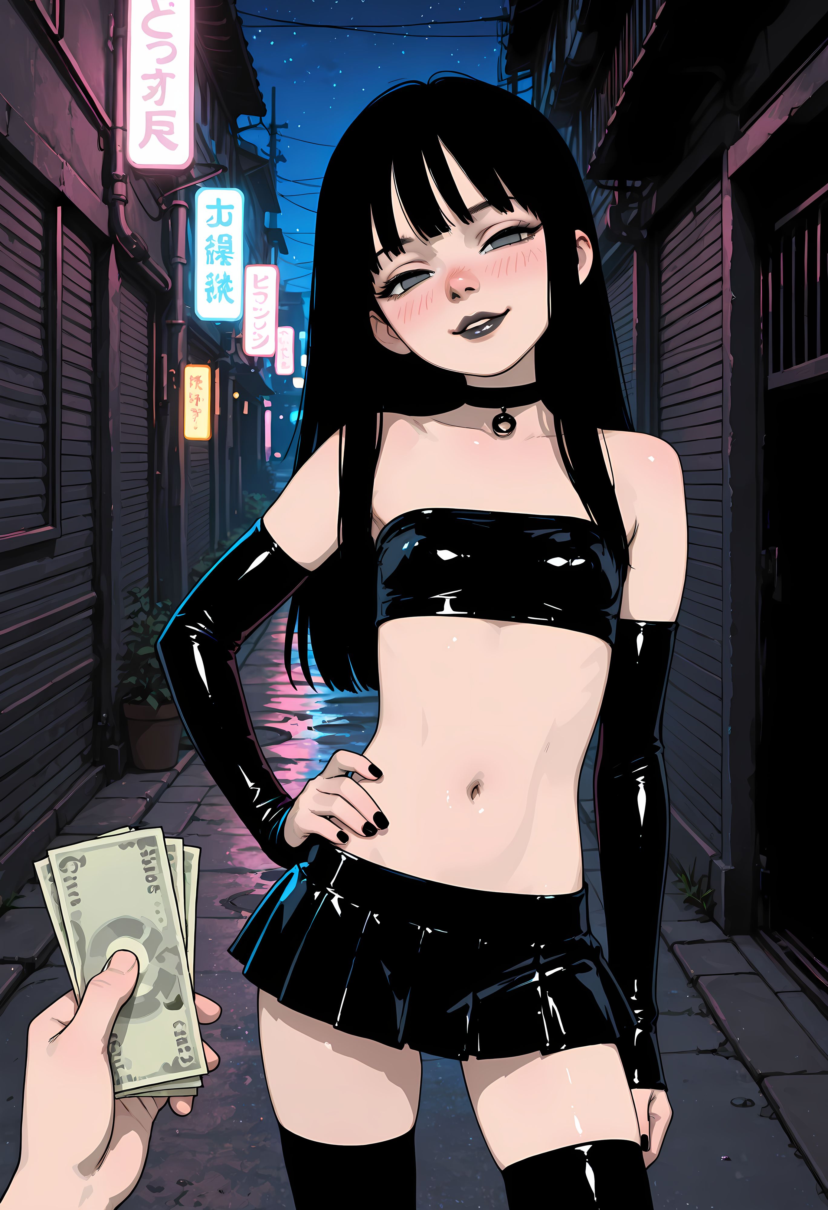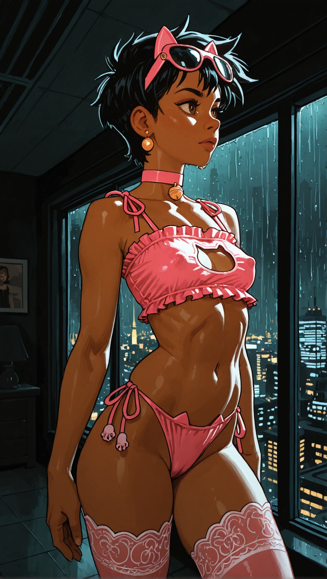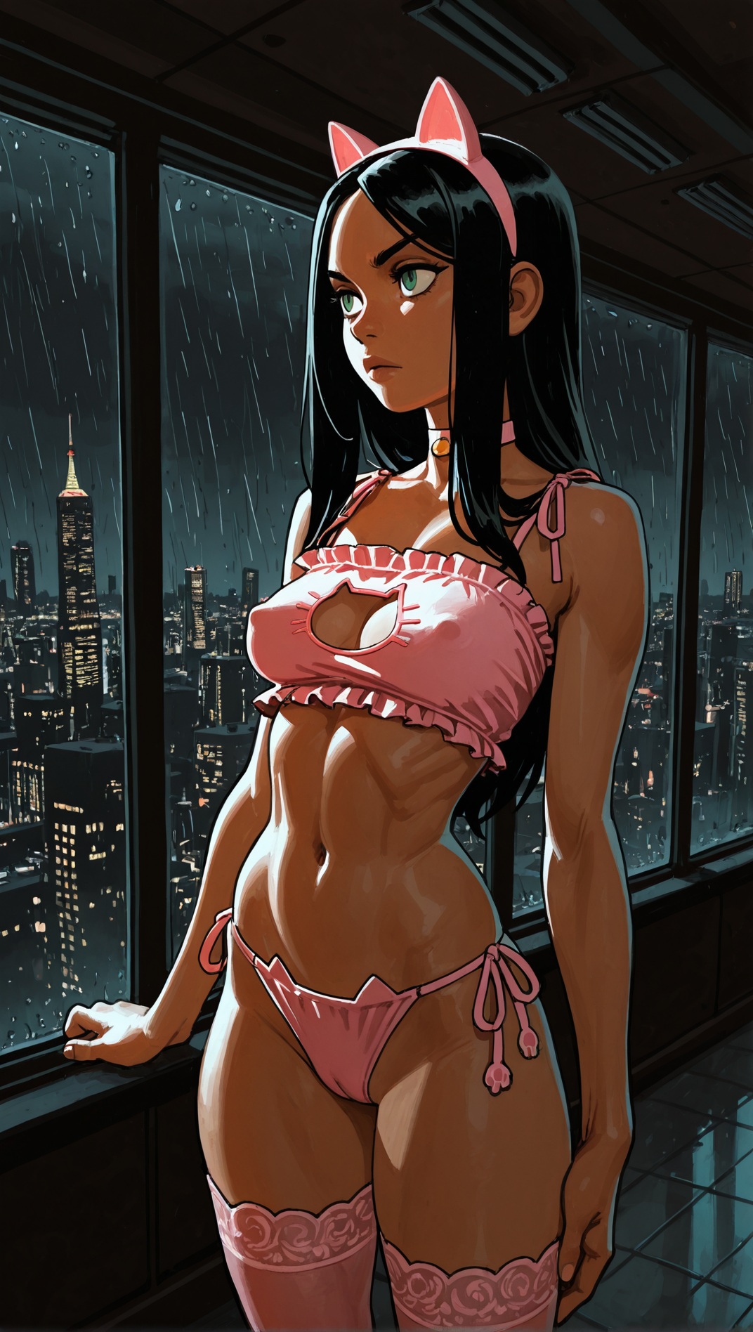 >>9479059701 girl, solo, elegant, {laura kinney, green eyes, long hair, black hair, petite, (toned:0.6), medium breasts, slender, aqua and pink lace trim|jubilee, marvel, 1girl, brown eyes, eyewear on head, black hair, short hair, small breasts, earrings, spiked hair, slender, yellow and pink lace trim}, cat lingerie, cat ear hairband, stockings, choker, indoors, penthouse, dark background, new york city, cityscape, ((large windows)), floor to ceiling windows, by joel jurion, (by pantsu-ripper:0.6), {looking at viewer, modeling, pinup pose|candid, looking afar, looking ahead, modeling, pinup pose|looking to the side, suprised, blush, flustered, caught, embarrassed, crack of light, (sidelighting)}, , rain outside, covered nipples, (cameltoe:0.8), aroused, {dynamic angle|side view, from side|rear view, from behind}, backlighting