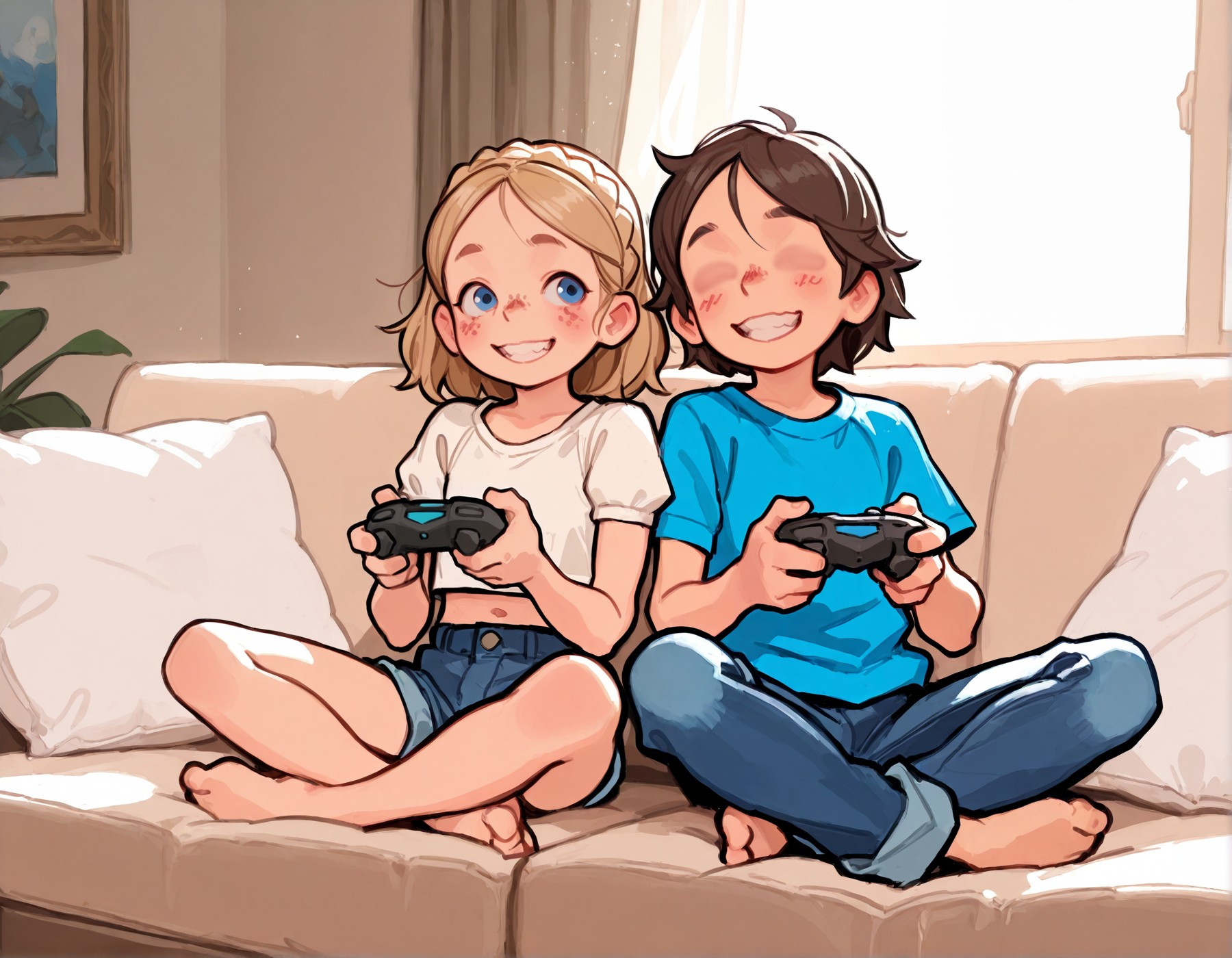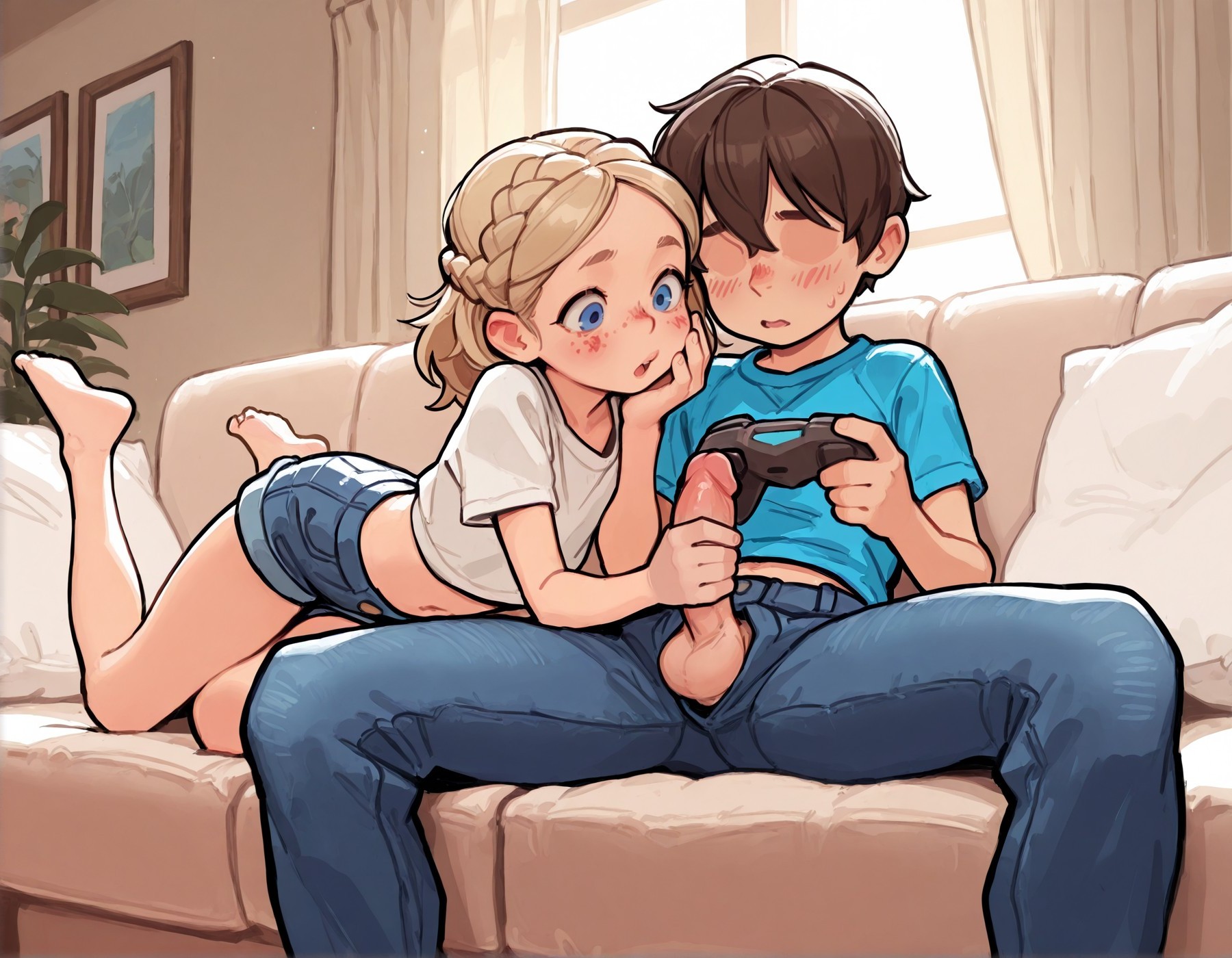 >>947912059>>947912154CUBE!! How goes it! Could you gen a naked boy trying to play vidya while a cute lil loli tries to distract him?