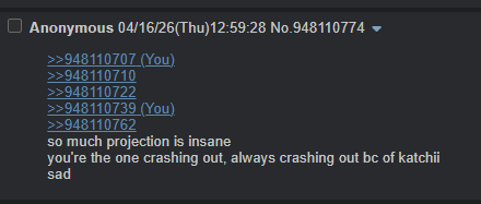 >>948110707>>948110710>>948110722>>948110739>>948110762so much projection is insaneyou're the one crashing out, always crashing out bc of katchiisad