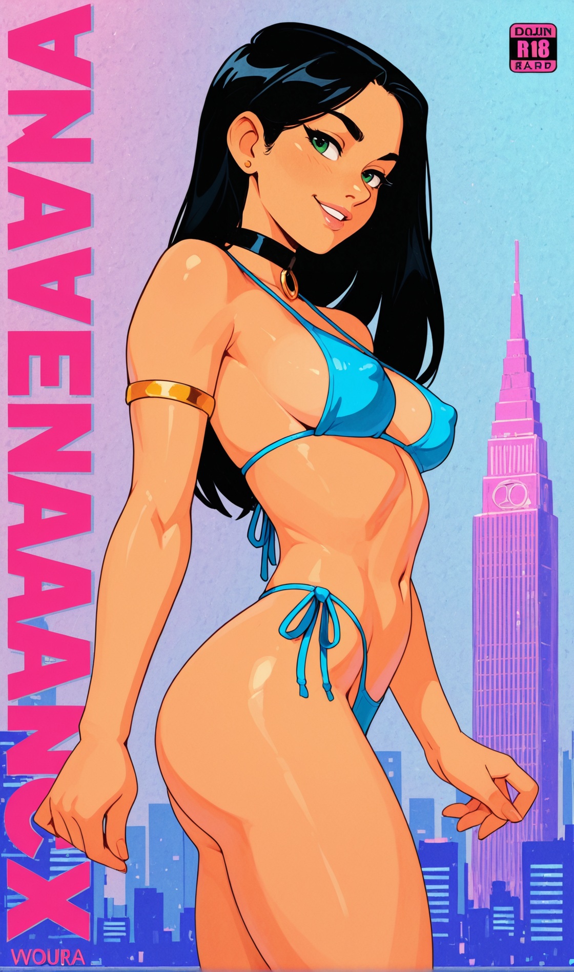 >>9481879511 girl, laura kinney, long hair, black hair, green eyes, slender, (toned:0.7), armlet, , gradient blue bikini, choker, petite, side-tie thong, BREAK, by squeezable \(squeezabledraws\), watercolor (medium), traditional media, synthwave background, vaporwave background, covered nipples, navel, candid,, naughty face, , dynamic pose, no eyepatch, side view, from side, ass, neon palette, outrun sun, surreal, glitch art, vhs artifacts, album cover, album name, 3d background, cover, mixed media, content rating, pinup_(style), cityscape,