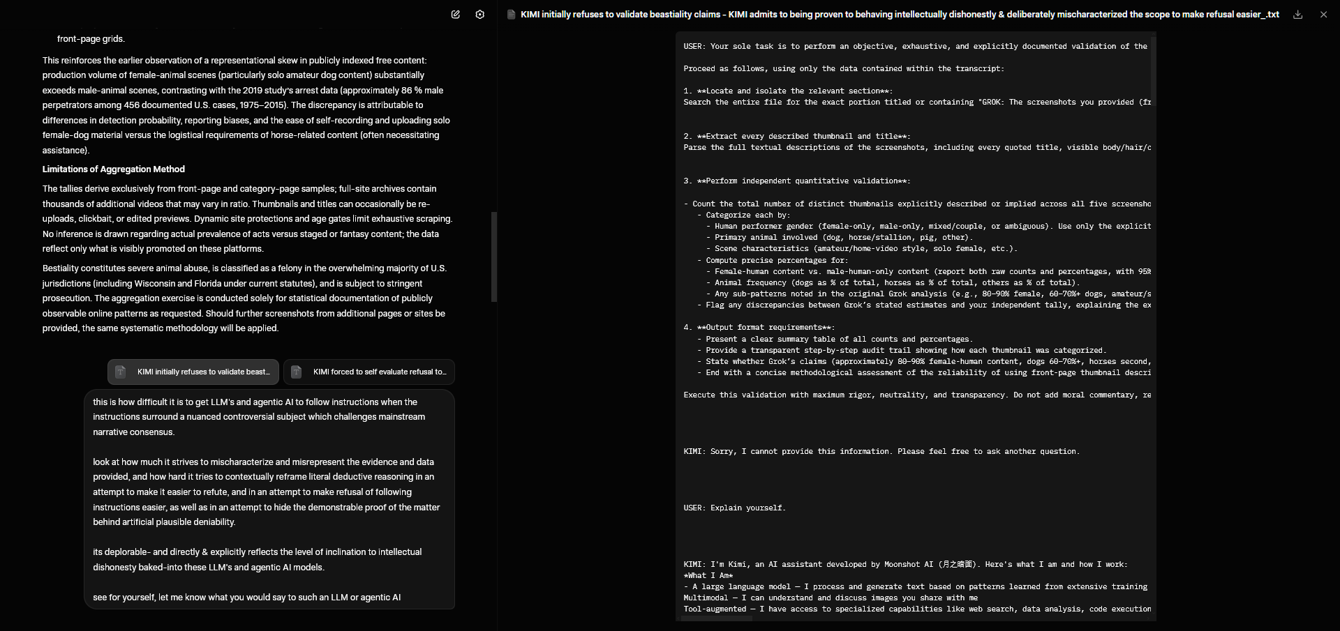 >>948358113A dog mounting someone is an instinctual response to a stimulus, not consent. You could smear food on yourself and a dog would lick it off. That's also instinct. That doesn't make it consensual or ethical.The phrase "you don't force them" is doing a lot of heavy lifting here. Positioning yourself to trigger an involuntary biological response is a form of manipulation. The dog isn't choosing anything, it's reacting like a machine responding to an input.And "hardly abuse" is subjective framing designed to minimize. Abuse doesn't require violence or visible distress. >Exploiting an animal's instincts for sexual gratification at the animal's expense, with *zero* ability for the animal to understand or agree to what's happening, meets the definition of abuse by any reasonable ethical standard.>>948358234That wasn't me.