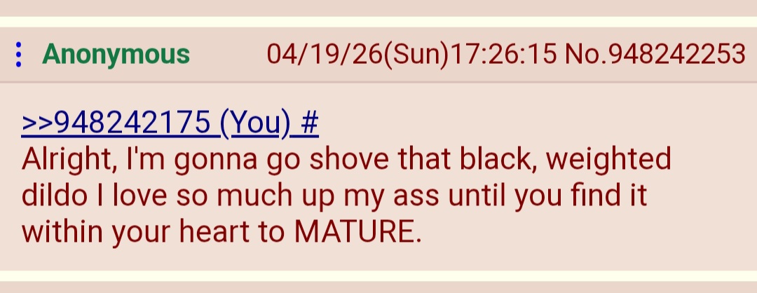 >>948358658Typical faggot response. Literally cannot comprehend a world outside of fetishized sex. Even their insults devolve to degenracy. It's sad to see people this fucking broken.