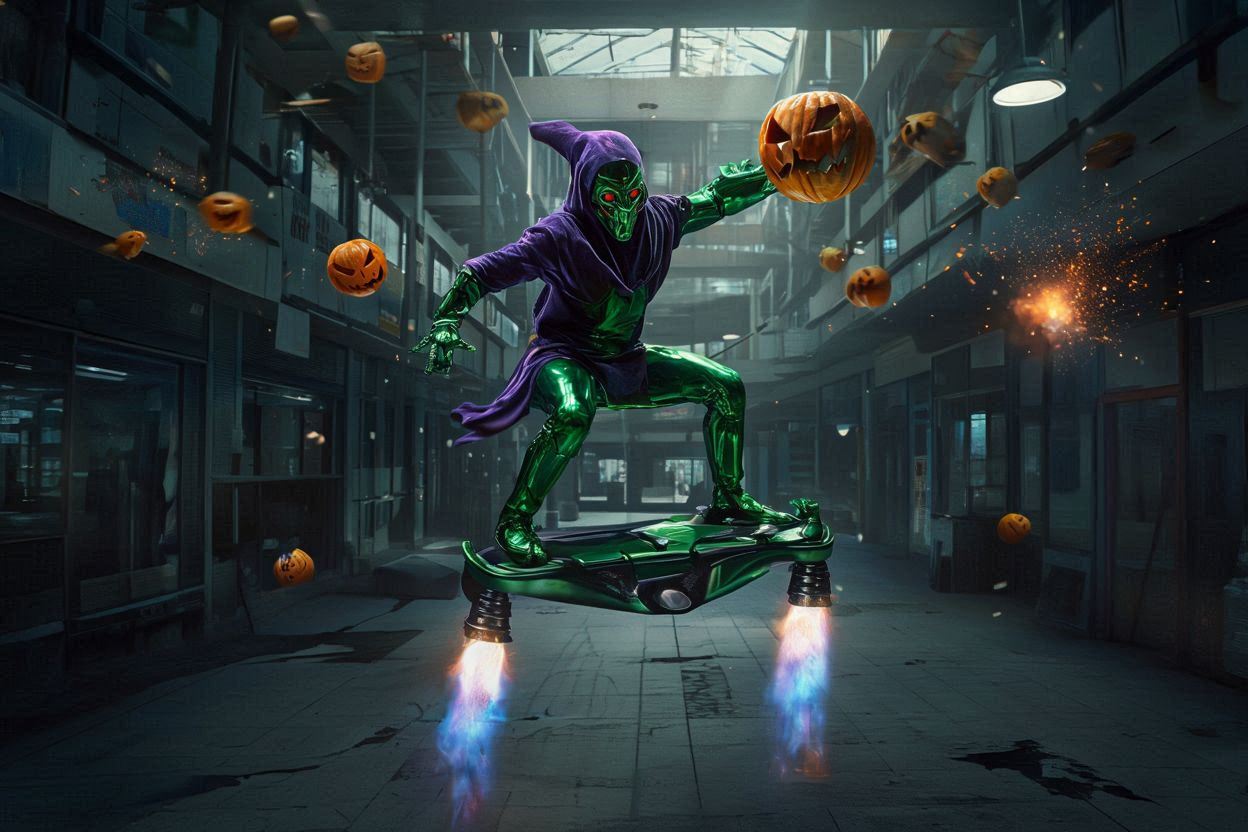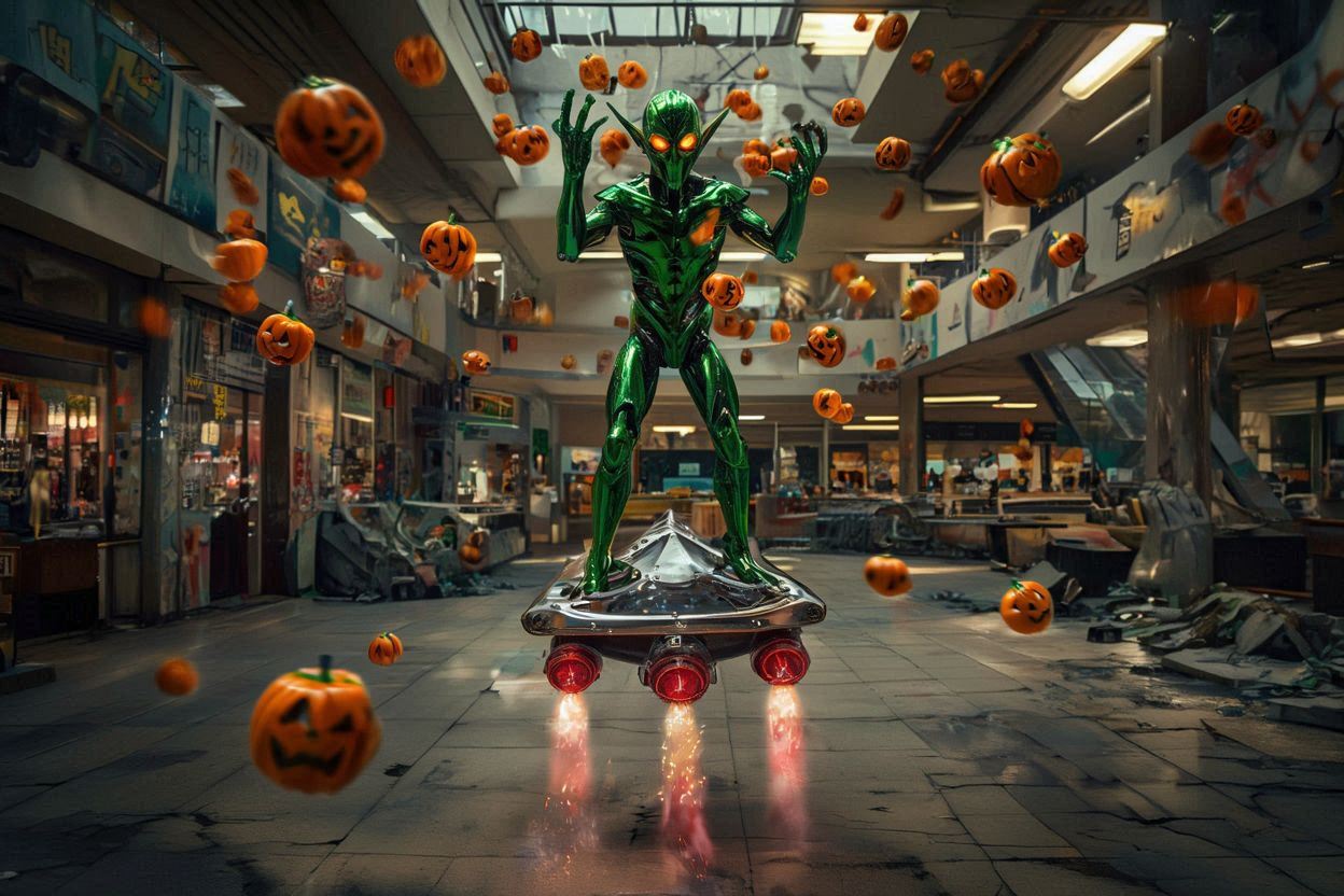 >>948372503I have to do work-arounds in the prompting kek>sleek sinister tall shiny metal green elf style guy with large glowing orange eyes riding a shiny metal silver triangular hoverboard with red jets, in the air and throwing tiny pumpkin grenades all over a run down mallbut it's getting there, o7